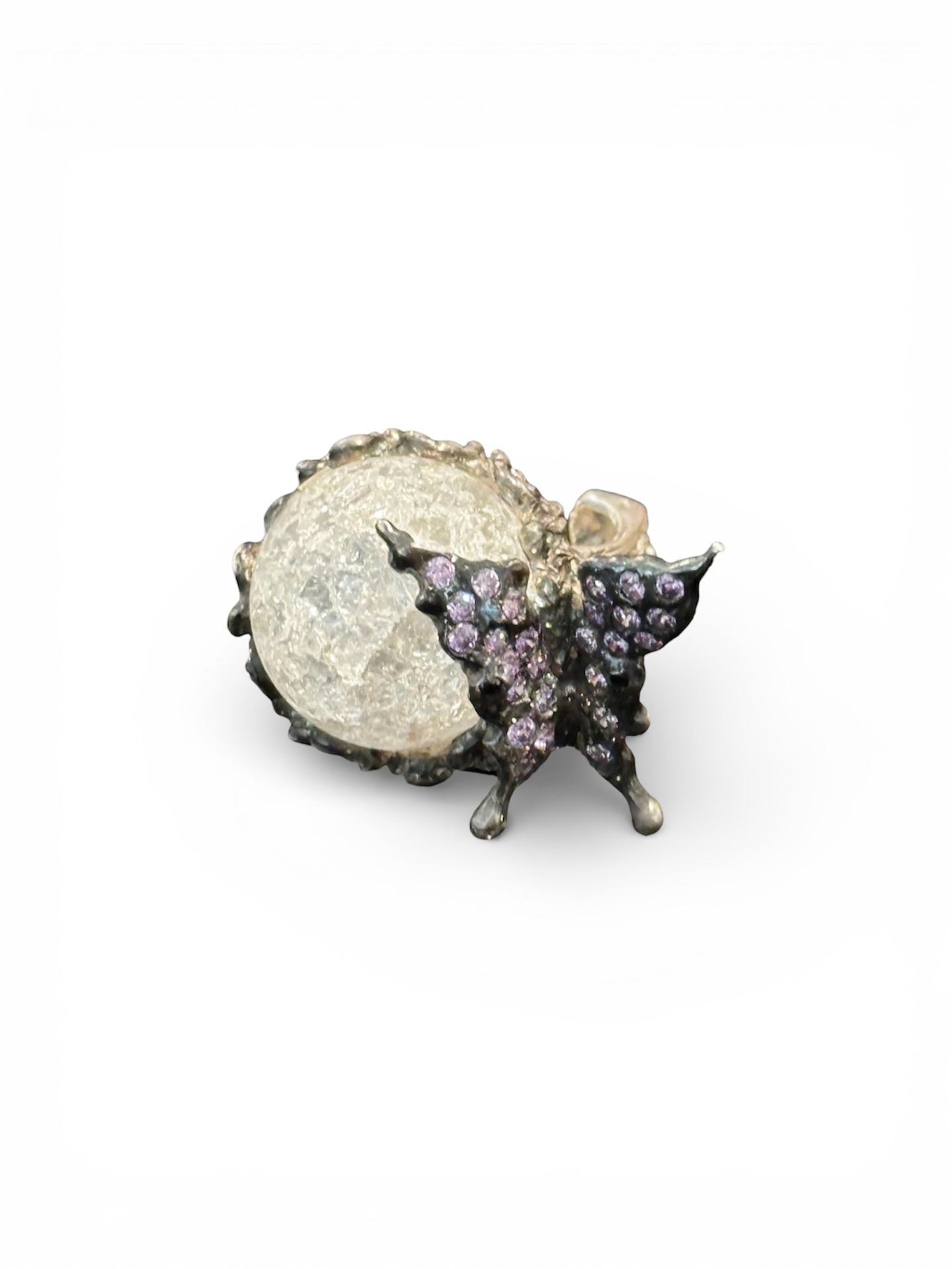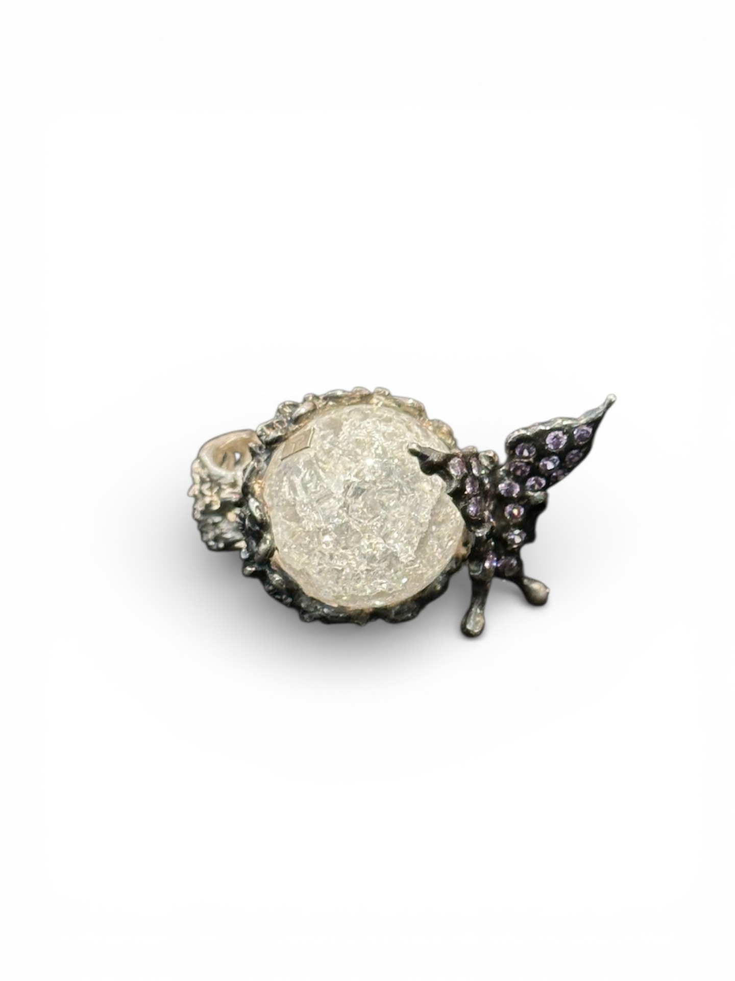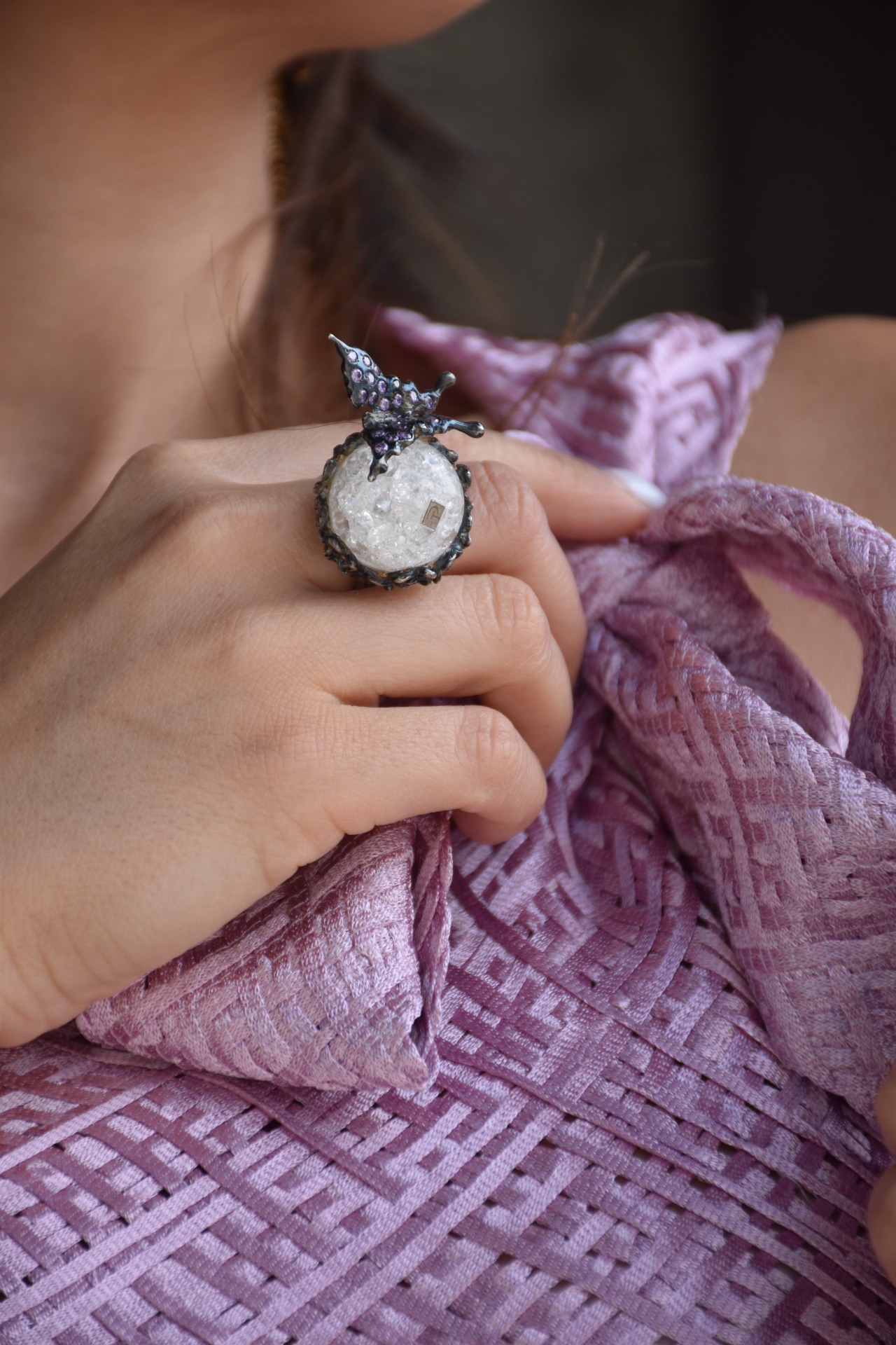 Anel flor em Prata 925 (20.55gr) com zircónias roxas, e cristal de rocha central.