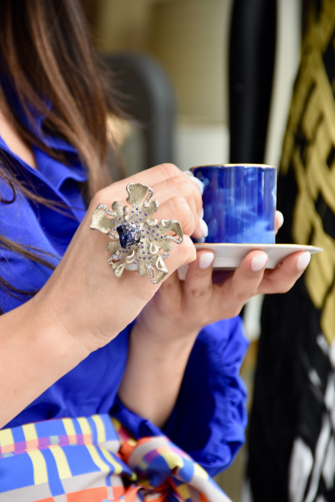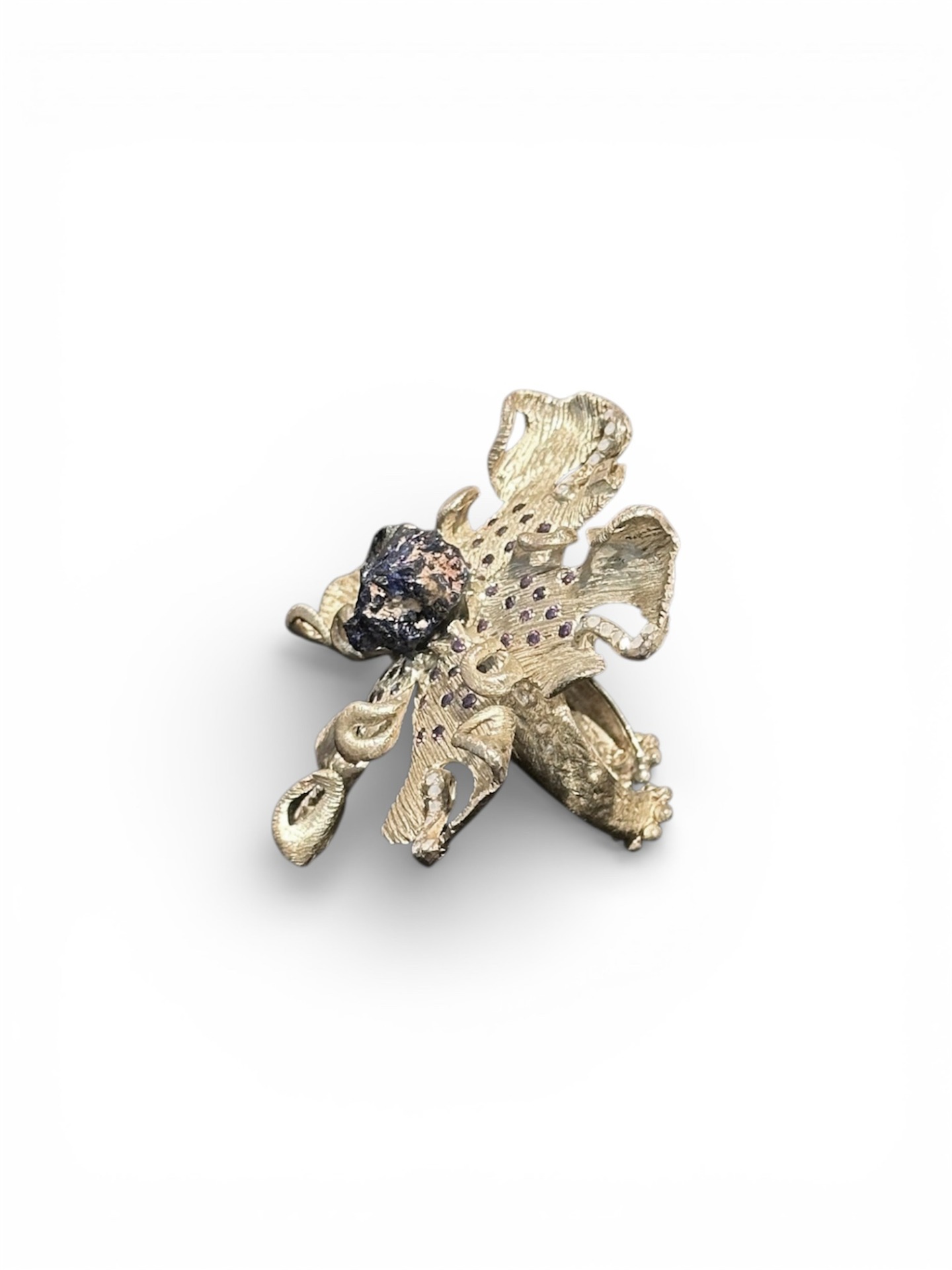 Anel flor em Prata 925 (35gr) com zircónias roxas e mineral azurite central.