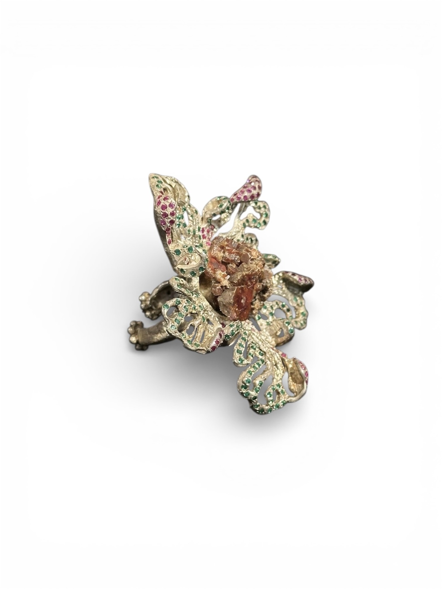 Anel flor em Prata 925 (45gr) com zircónias verdes e cor de rosa, e mineral vanadinite central.