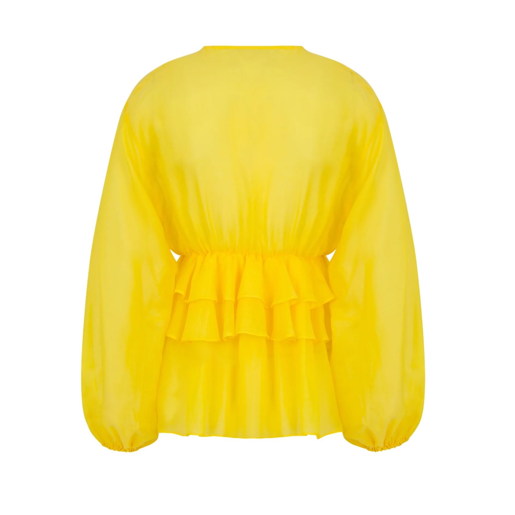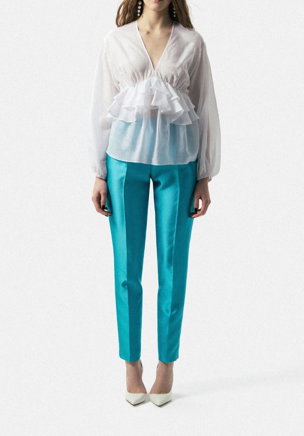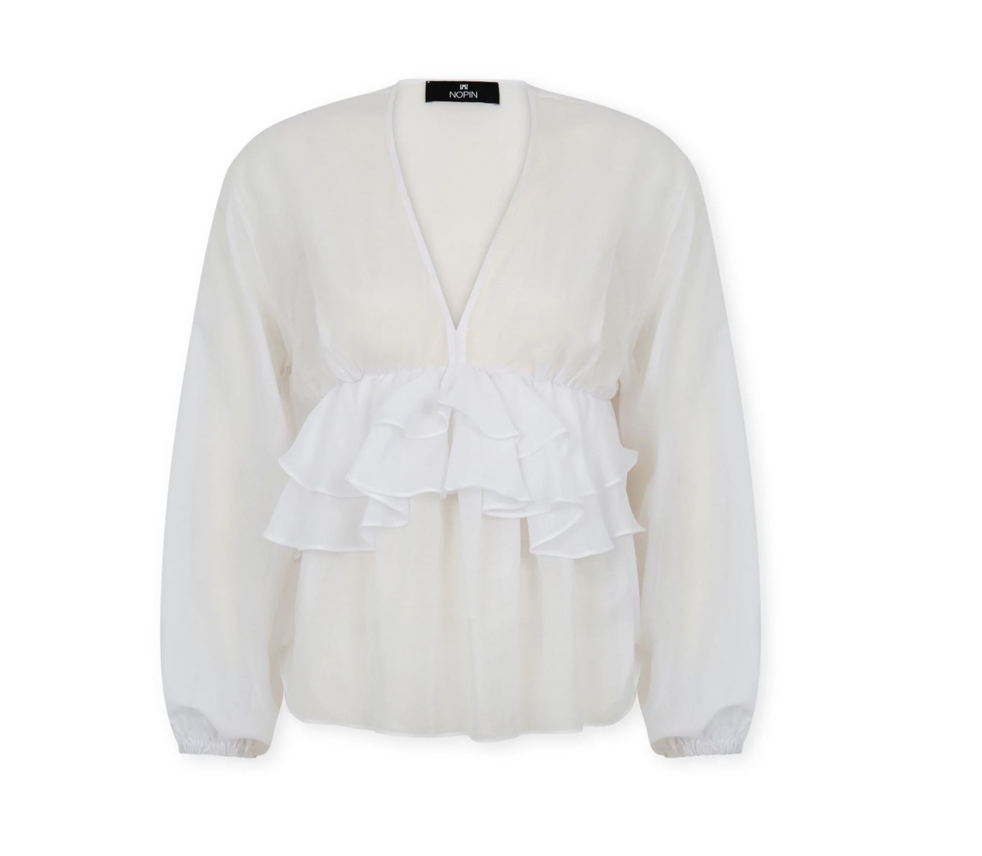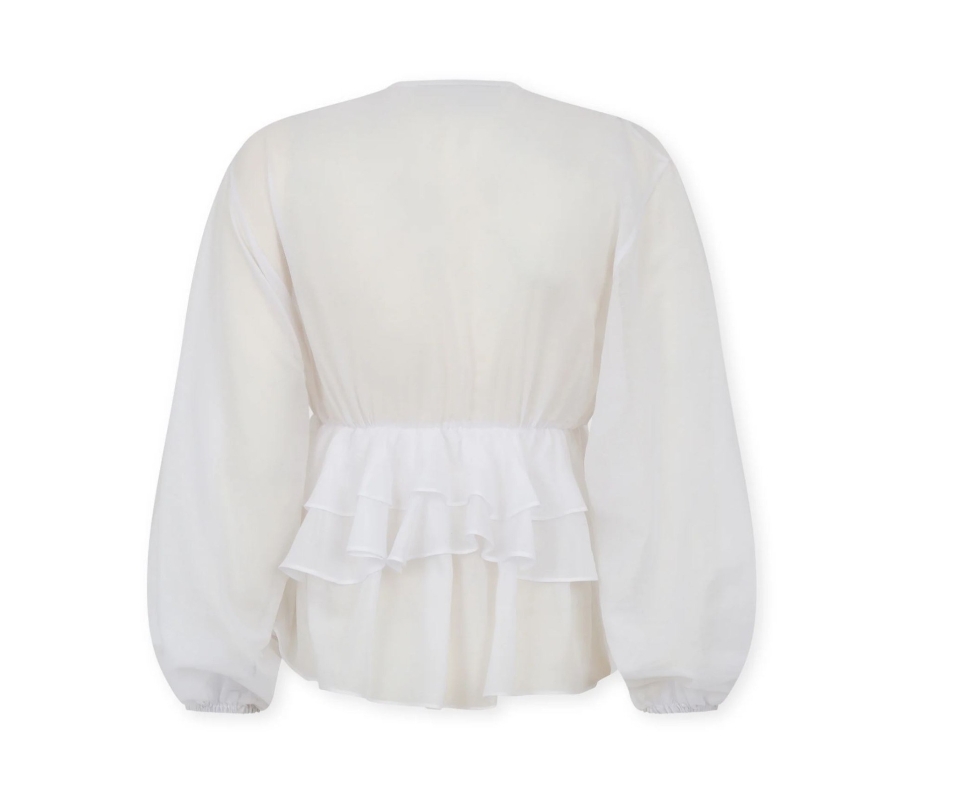 Blusa com decote em V e mangas compridas, punhos elásticos com franjas e folhos na frente e nas costas.