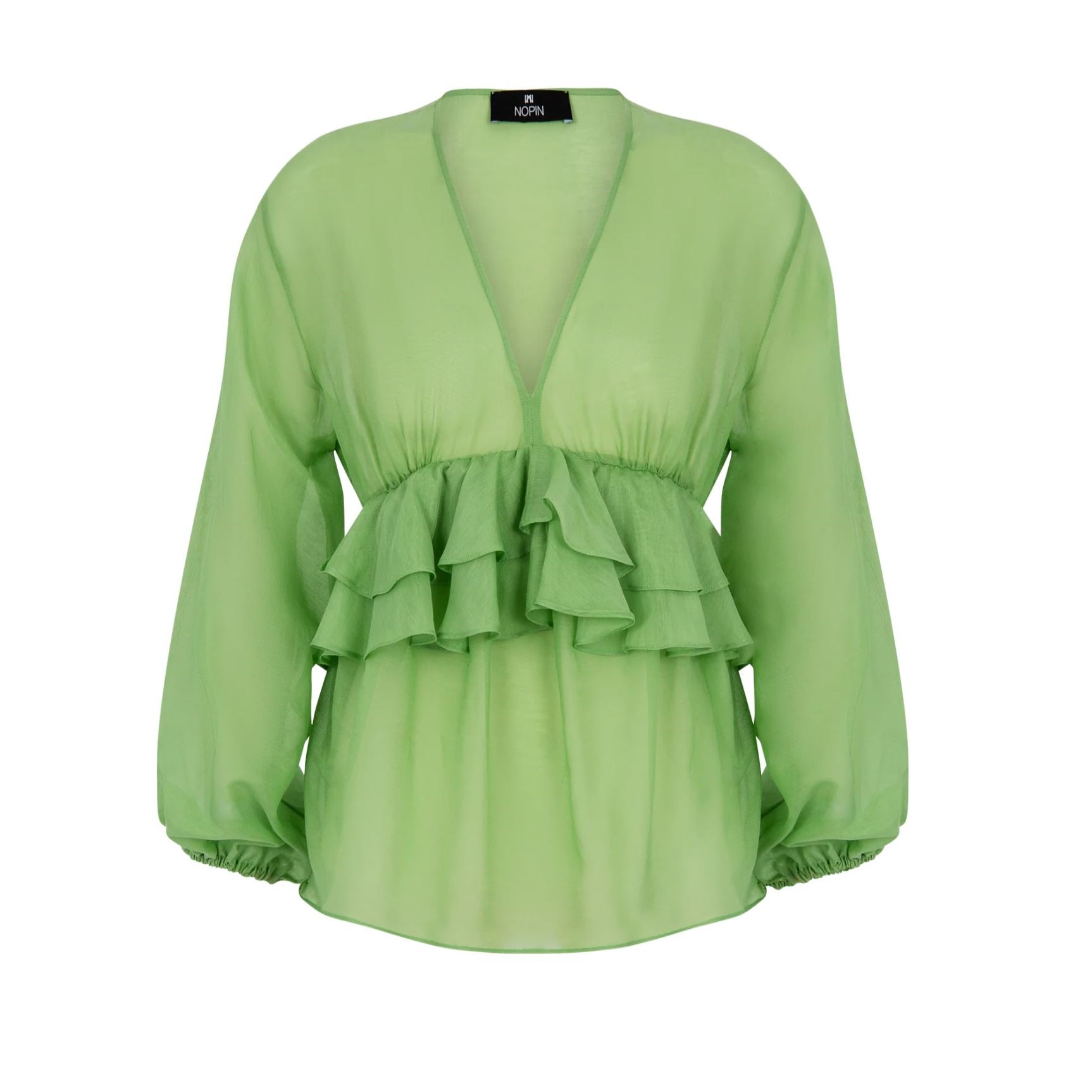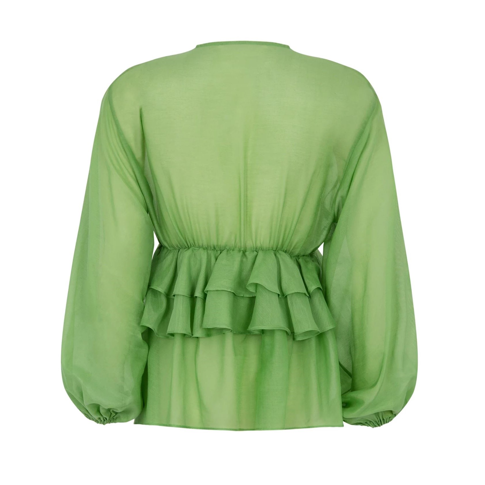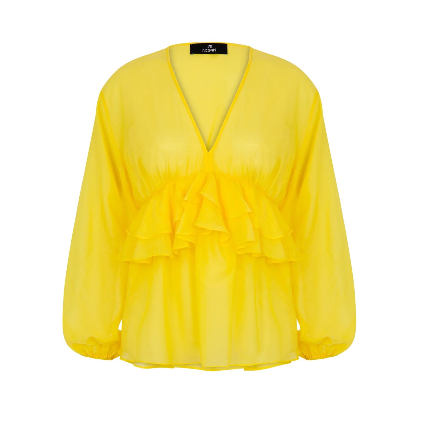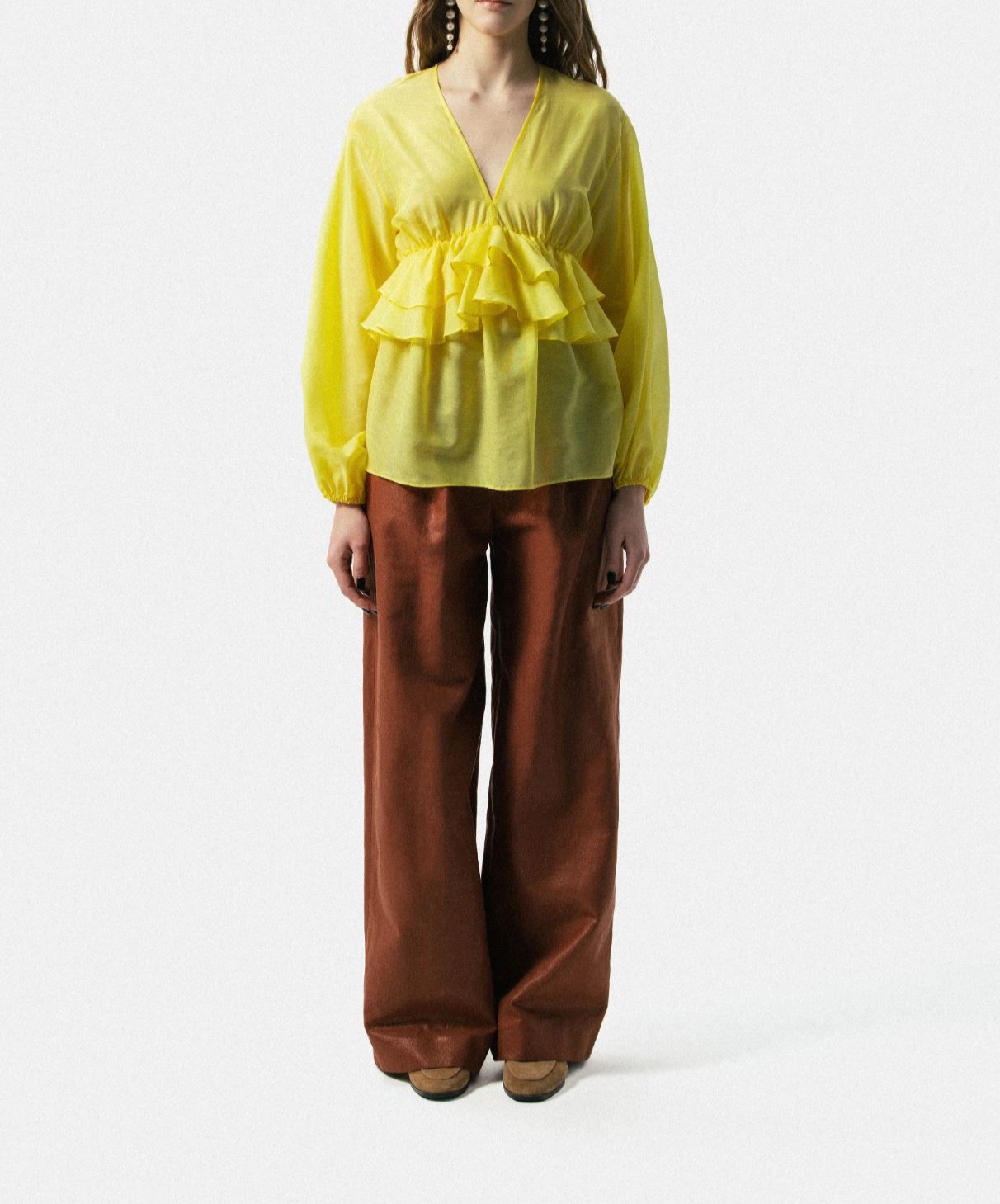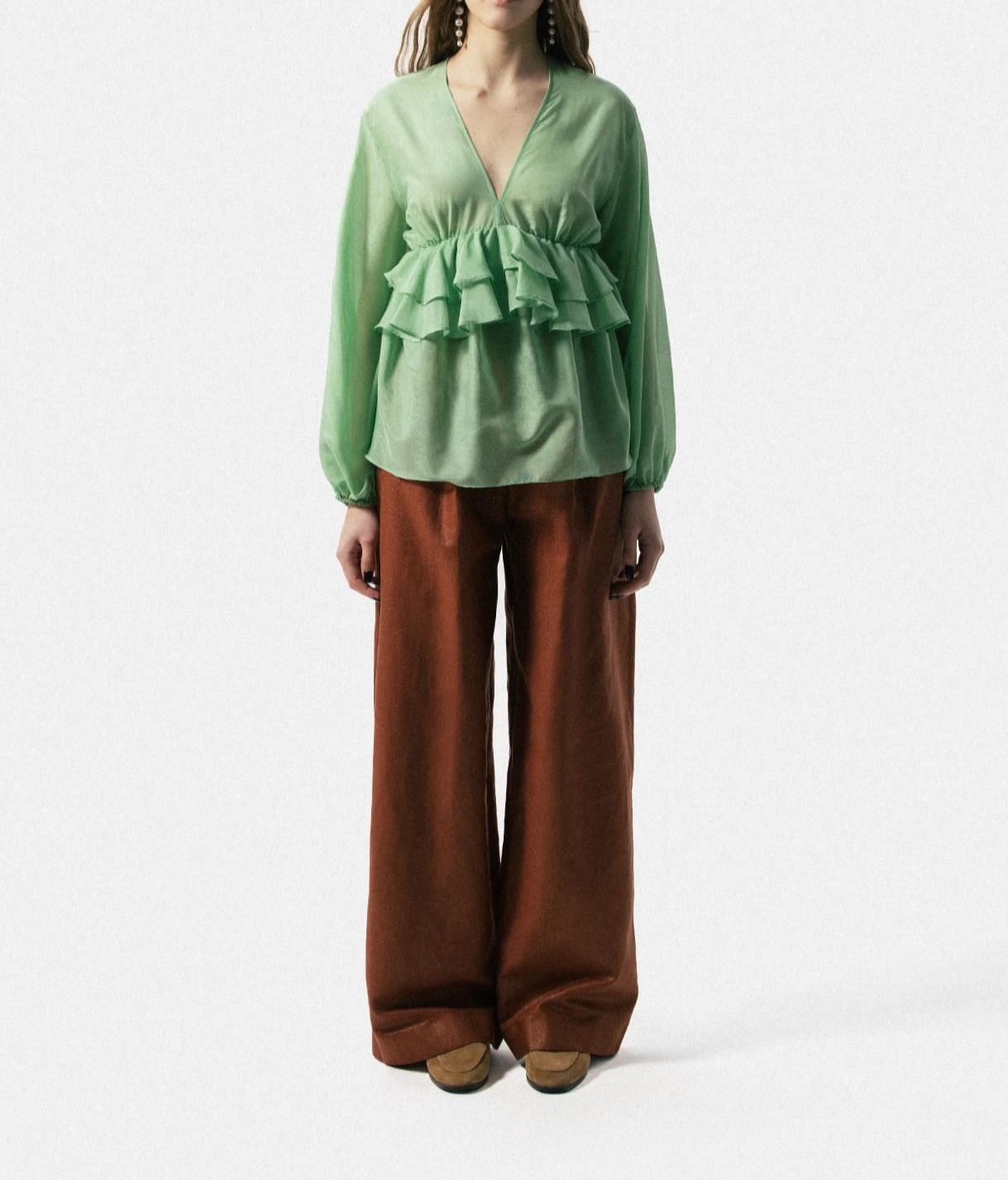 Blusa com decote em V e mangas compridas, punhos elásticos com franjas e folhos na frente e nas costas.
