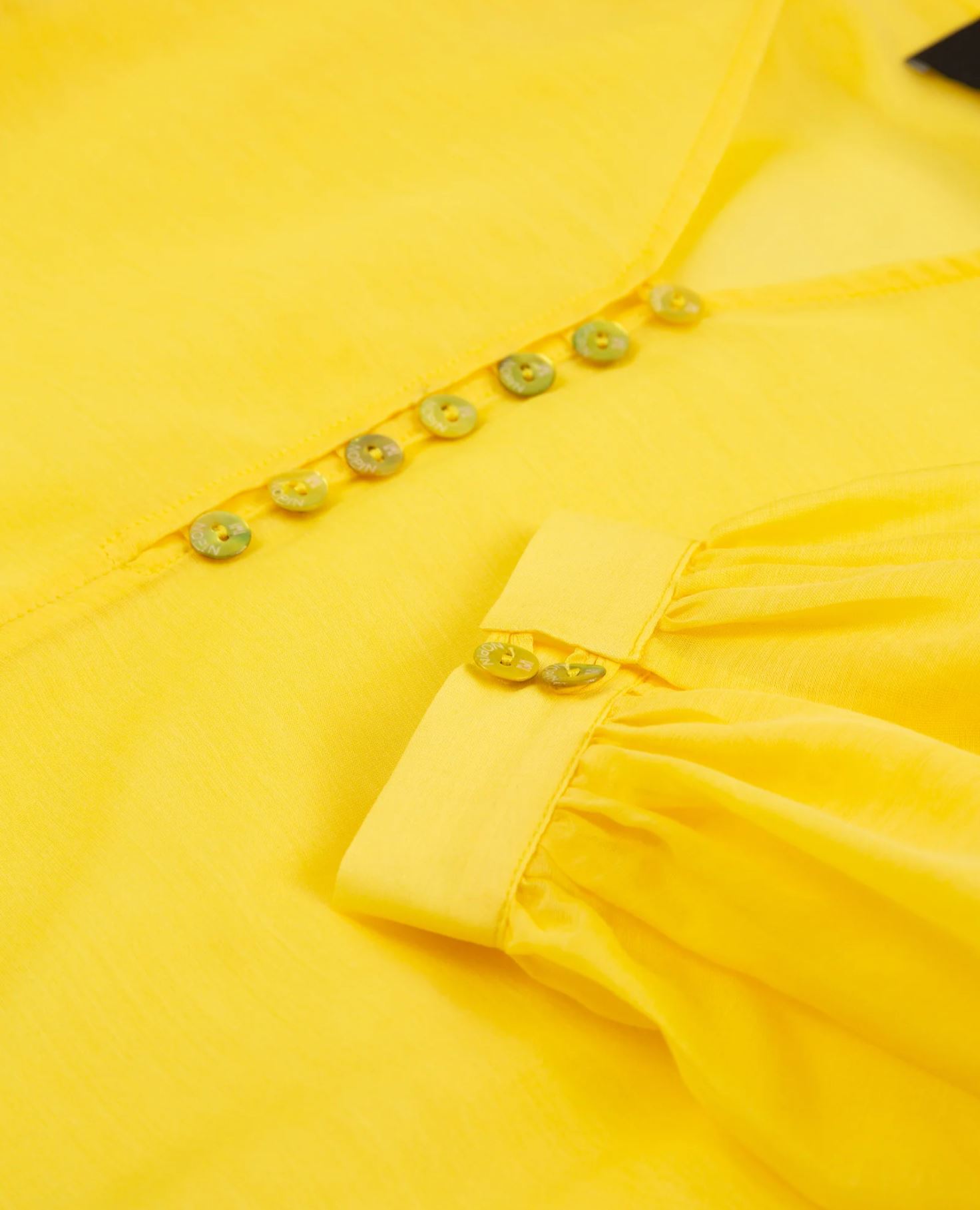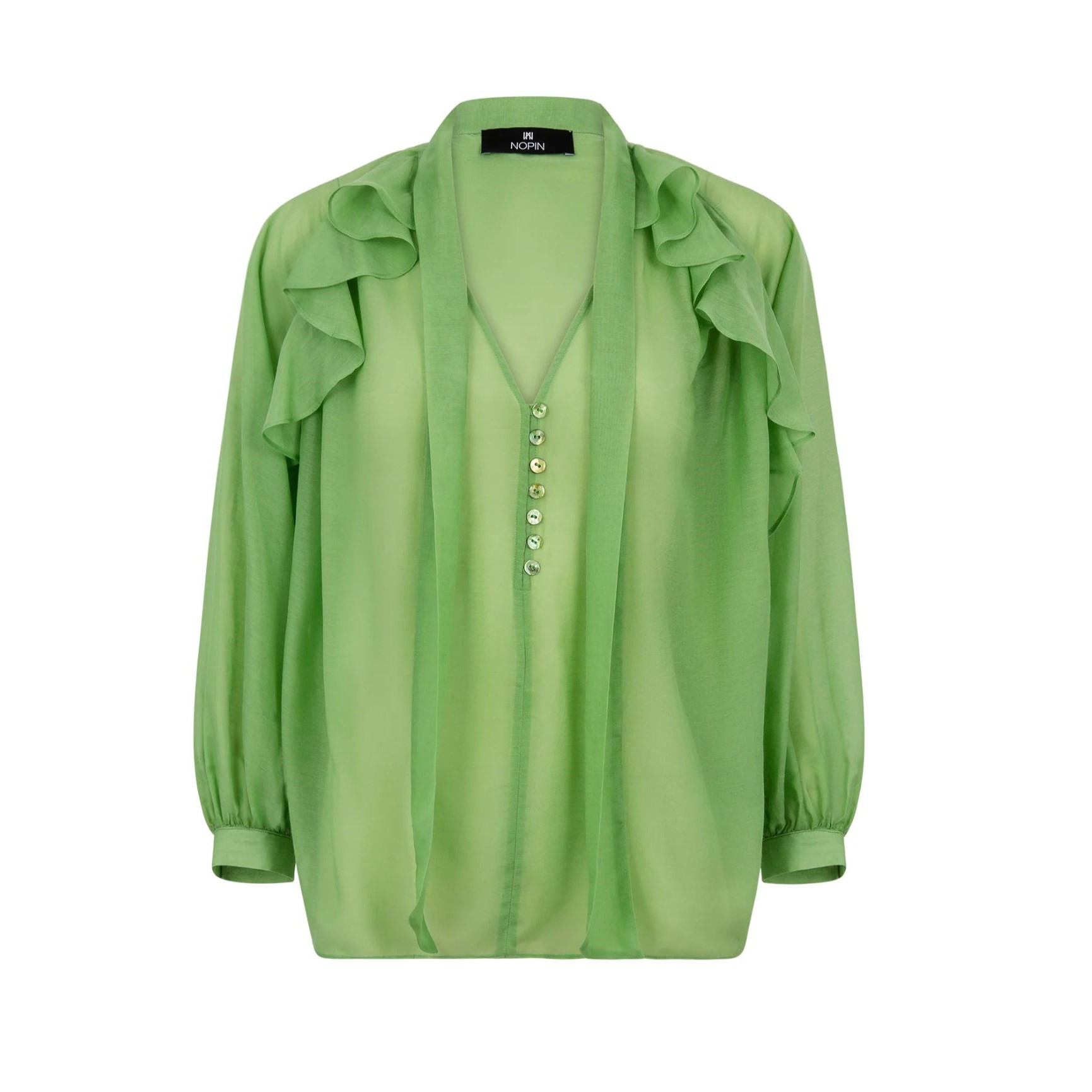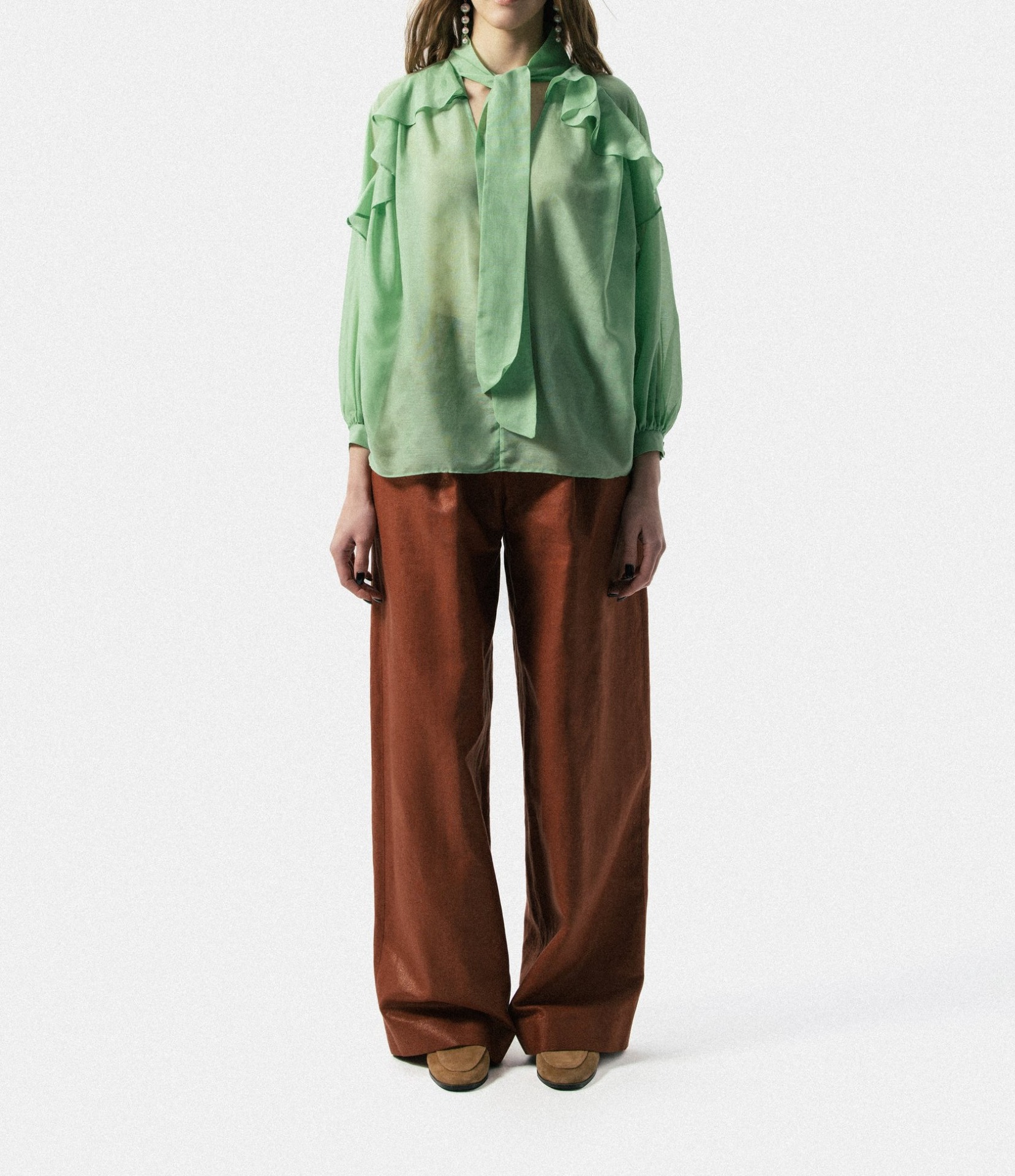 A blusa com decote em V apresenta ombros franzidos à frente e atrás, com folhos evasé, punhos e botões de madrepérola pintados à mão com a inscrição NOPIN na frente. A blusa tem um laço no decote. Peça produzida em Portugal.