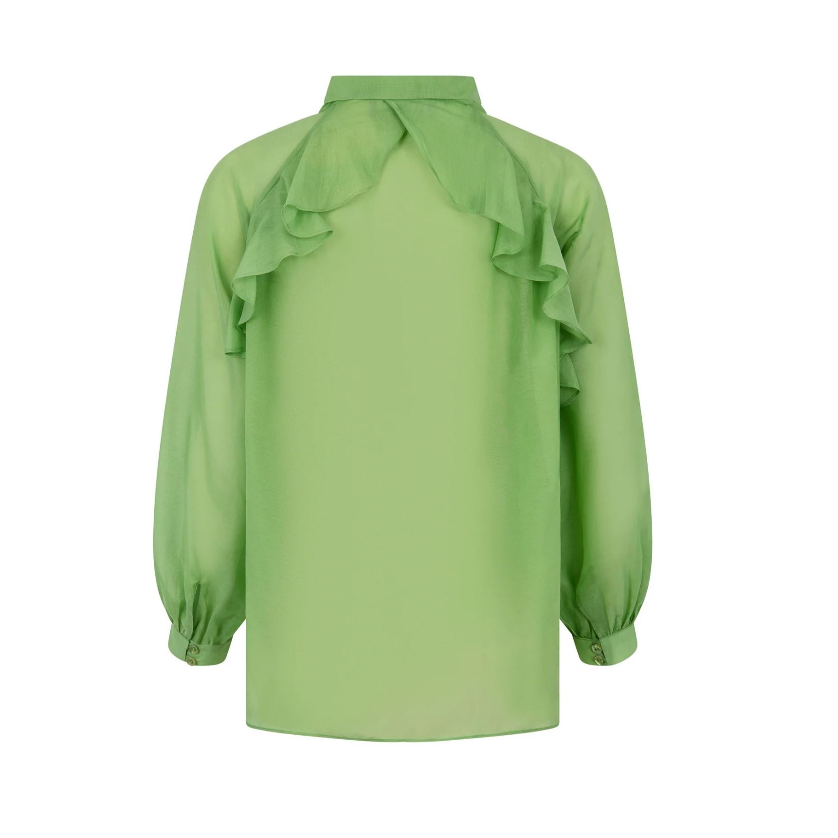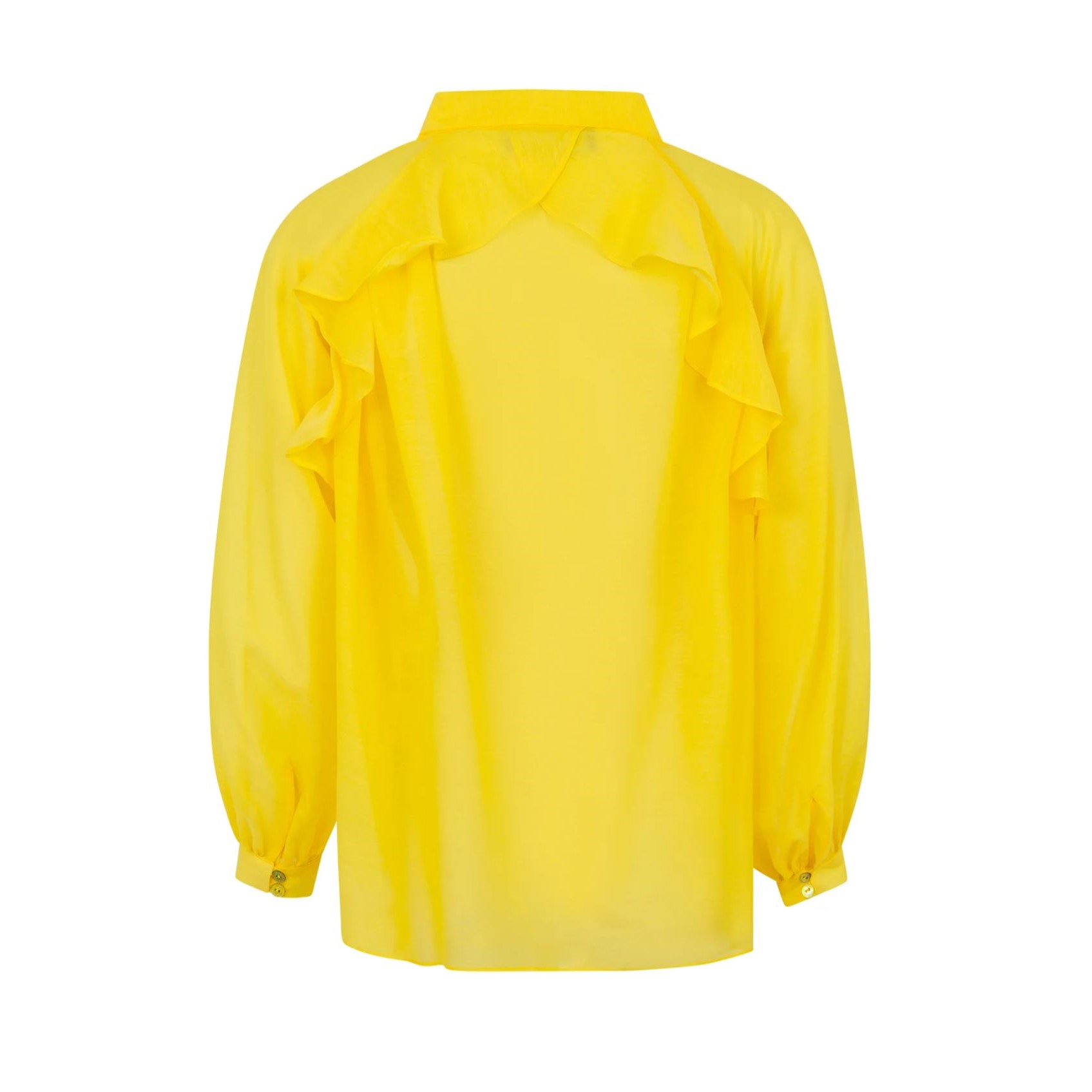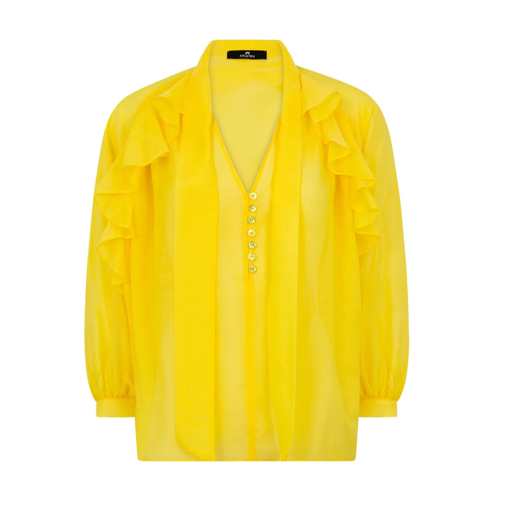 A blusa com decote em V apresenta ombros franzidos à frente e atrás, com folhos evasé, punhos e botões de madrepérola pintados à mão com a inscrição NOPIN na frente. A blusa tem um laço no decote. Peça produzida em Portugal.