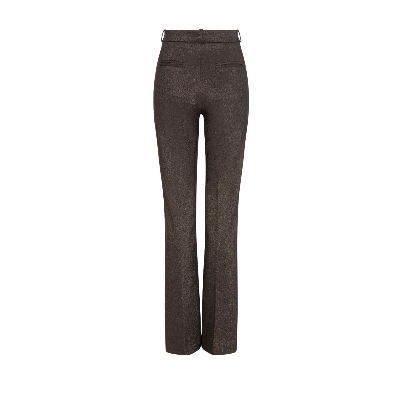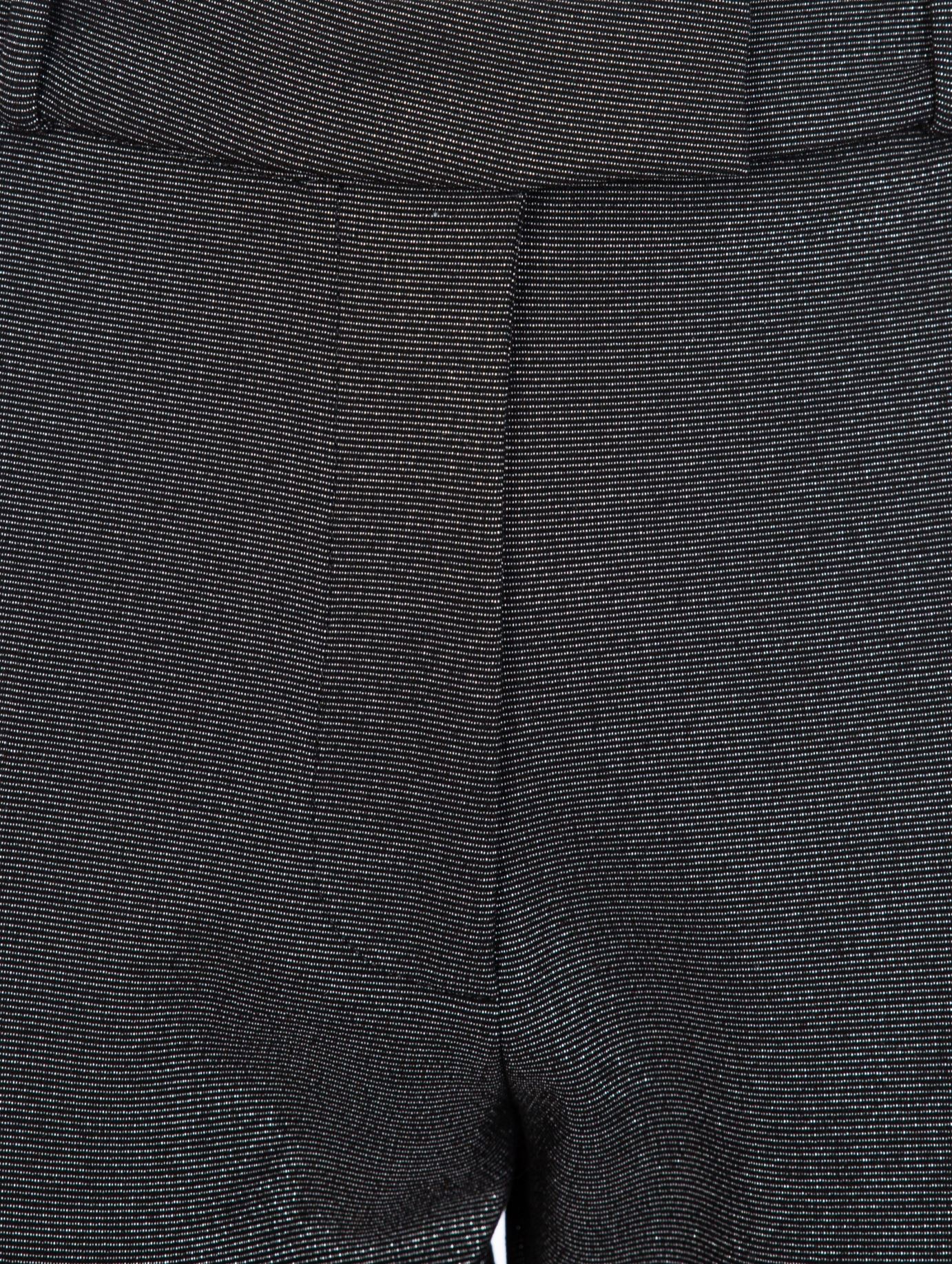 Calças retas brilhantes, uma peça moderna confeccionada em tecido português com lurex brilhante. Estas calças de corte reto apresentam bolsos à frente e atrás, fecho oculto e um detalhe prateado na parte da frente.