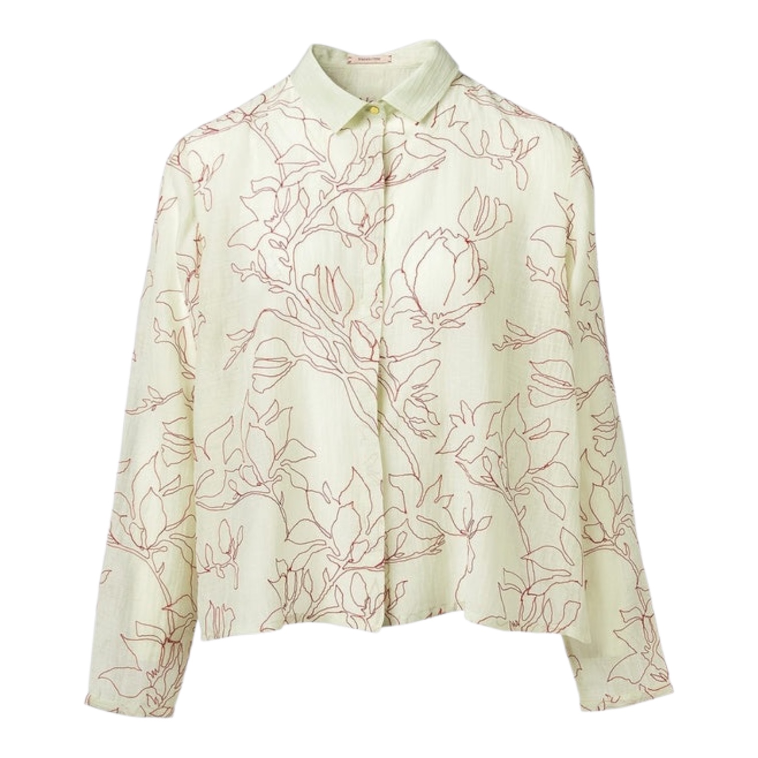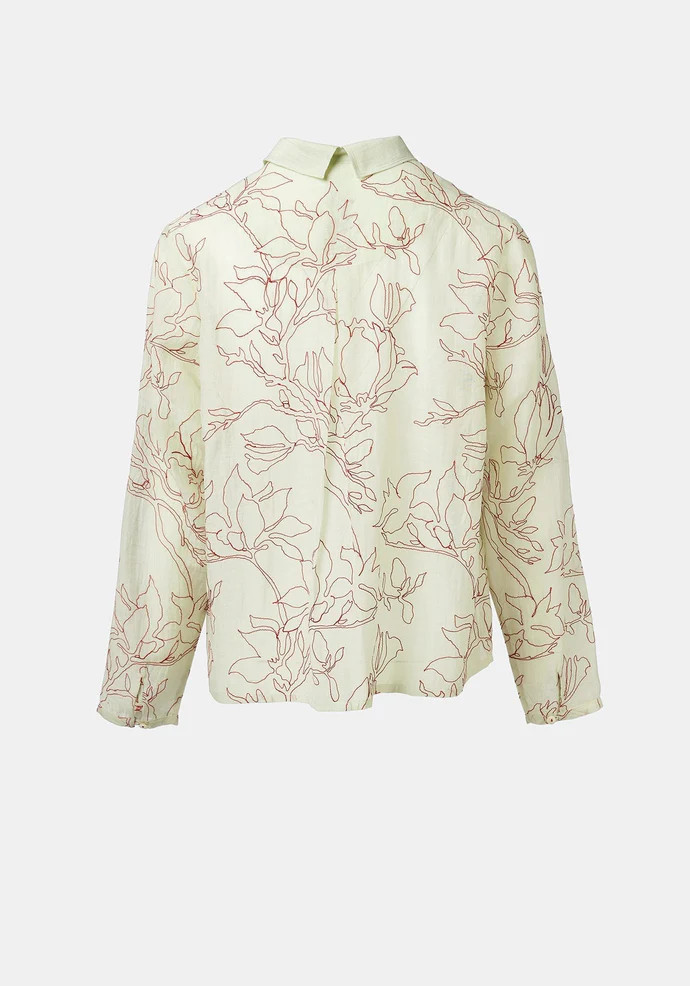 Camisa evasé leve em chanderi de algodão natural, adornada com bordado floral intrincado em fio de cetim Rouge. Uma prega funda nas costas aumenta o conforto, enquanto um botão metálico de assinatura adiciona um detalhe exclusivo. Logótipo bordado no interior