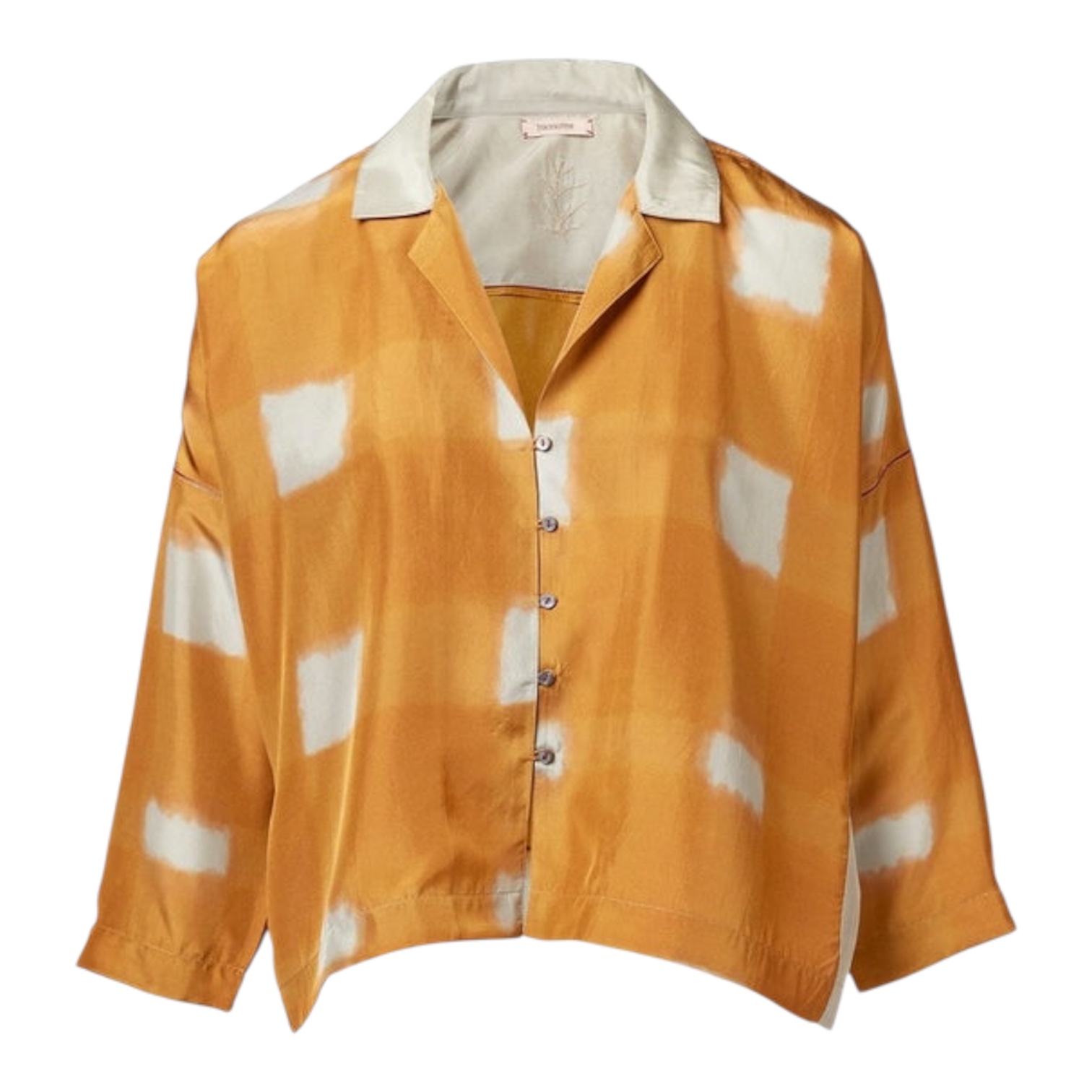 Camisa fluida em seda com abotoamento frontal, lapela entalhada e mangas 3/4, com estampa digital exclusiva TM. Fitas laterais delicadas, ajours contrastantes e pespontos metálicos acrescentam um toque refinado, tornando‑a uma camada leve e elegante. Logótipo bordado no interior.