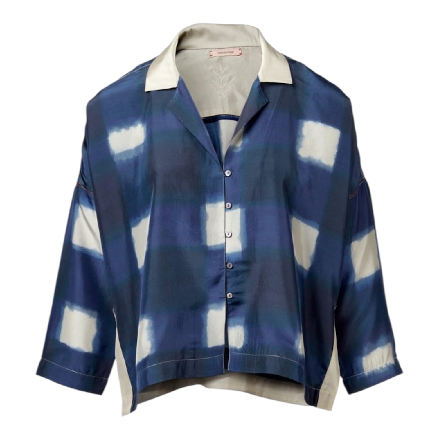 Camisa fluida em seda com abotoamento frontal, lapela entalhada e mangas 3/4, com estampa digital exclusiva. Fitas laterais delicadas, ajours contrastantes e pespontos metálicos acrescentam um toque refinado, tornando‑a uma camada leve e elegante. Logótipo bordado no interior.