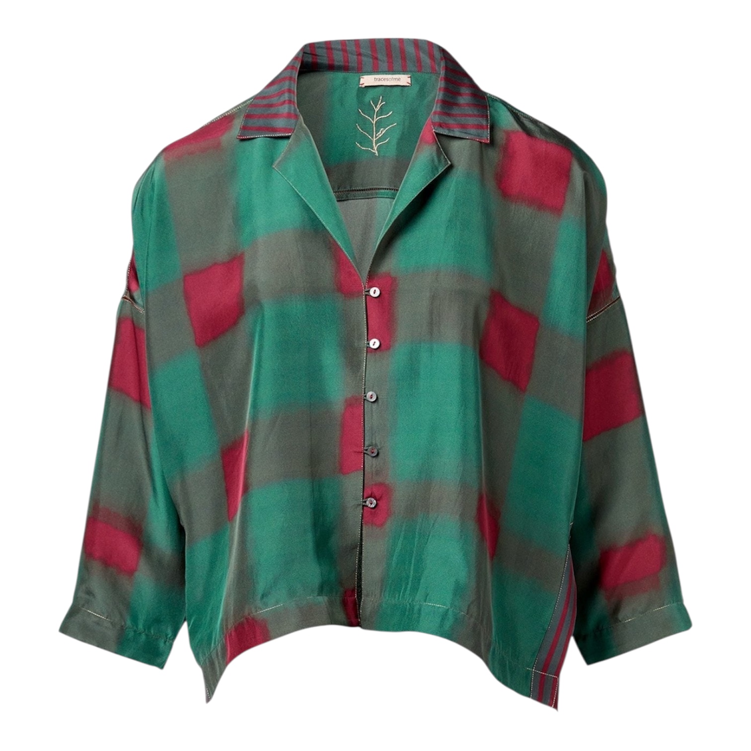 Camisa fluida em seda com abotoamento frontal, lapela entalhada e mangas 3/4, com estampa digital exclusiva. Fitas laterais delicadas, ajours contrastantes e pespontos metálicos acrescentam um toque refinado, tornando‑a uma camada leve e elegante. Logótipo bordado no interior.