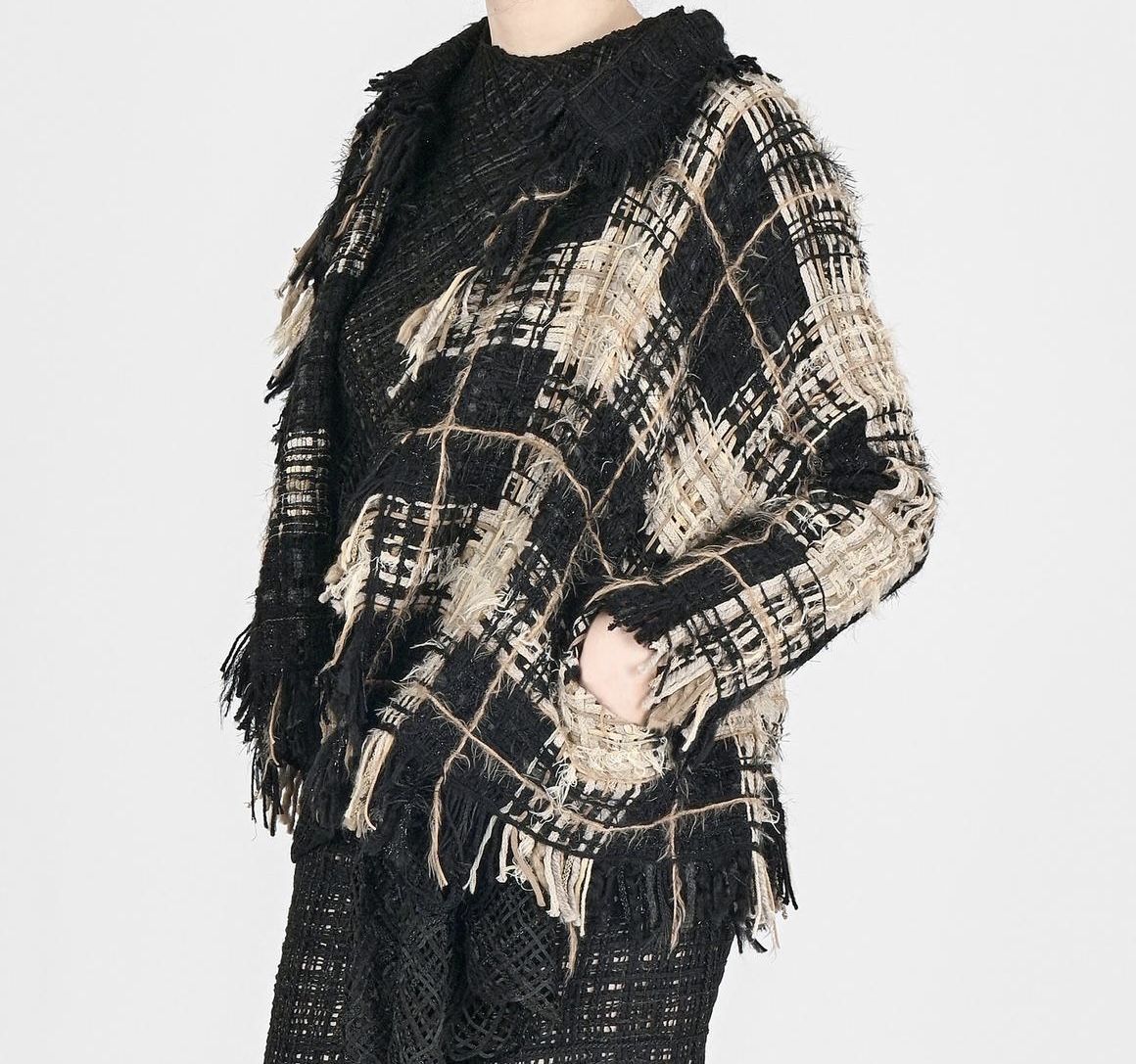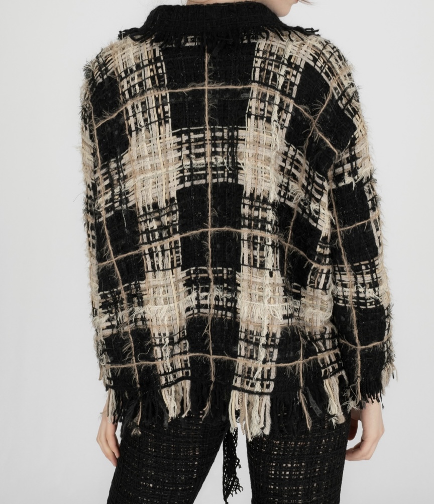 Casaco confeccionado em mistura de fios trabalhados artesanalmente. Casaco de mangas estilo quimono ajustadas, com fecho por botão sob a gola. O corte solto e estruturado cria uma silhueta elegante e discreta. Peça feita artesanalmente em Portugal.