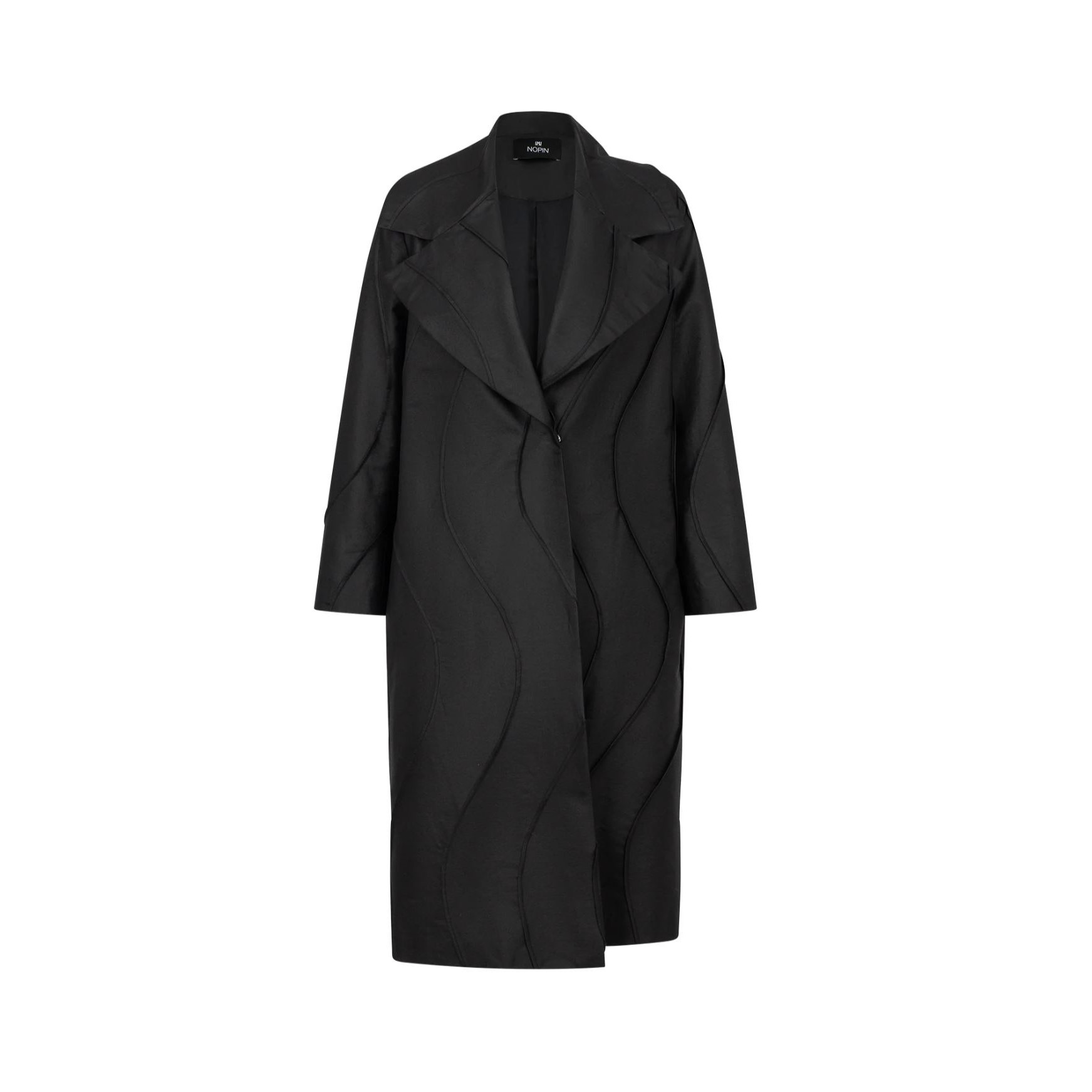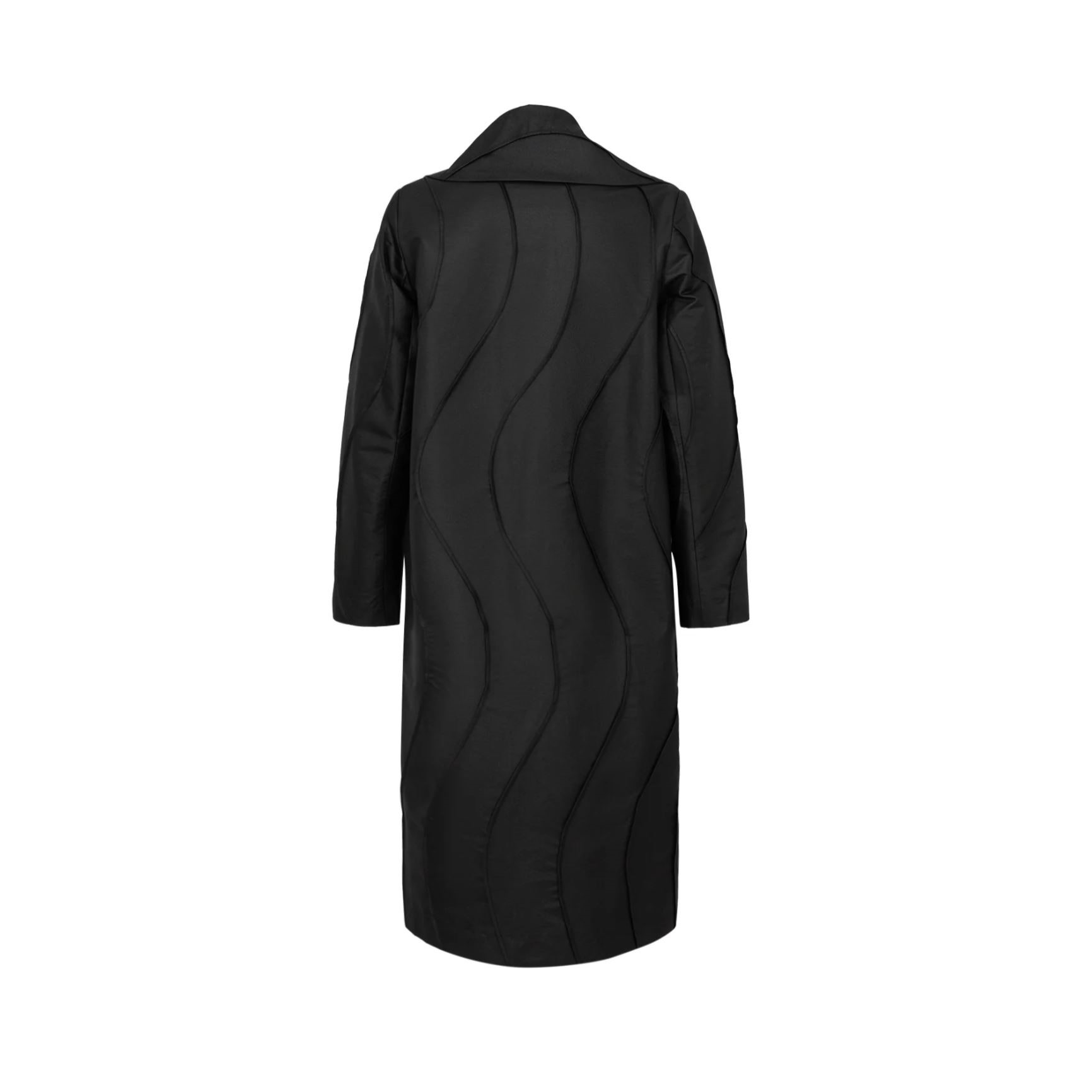 Casaco longo preto, uma peça moderna confeccionada em tecido português. Este casaco comprido com gola possui bolsos embutidos e um fecho de pressão metálico prateado no interior, na parte da frente. O casaco é forrado e apresenta pregas onduladas criadas manualmente.