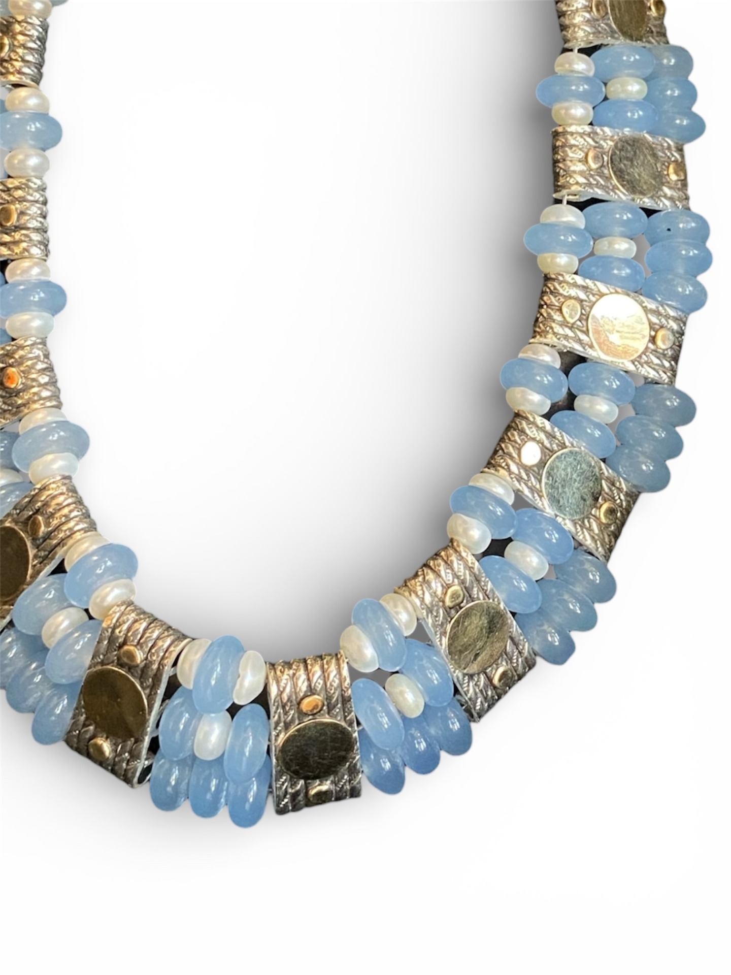 Colar de Prata (103gr) e Ouro (5gr) com pedras calcedônias azuis.