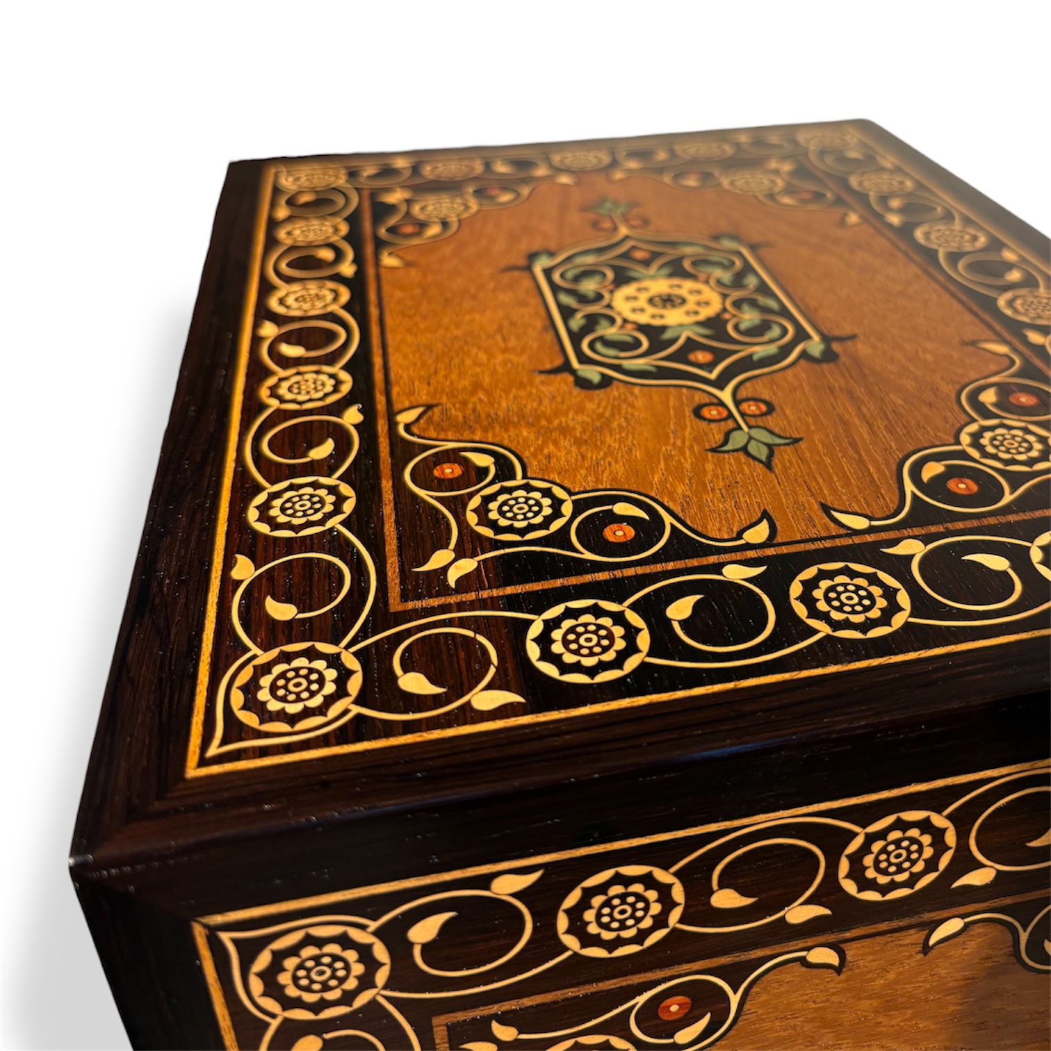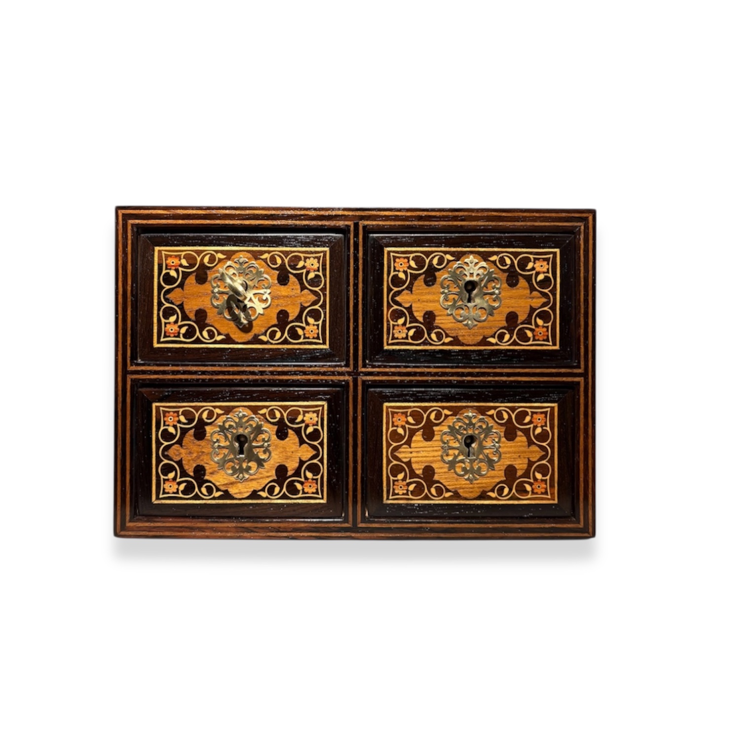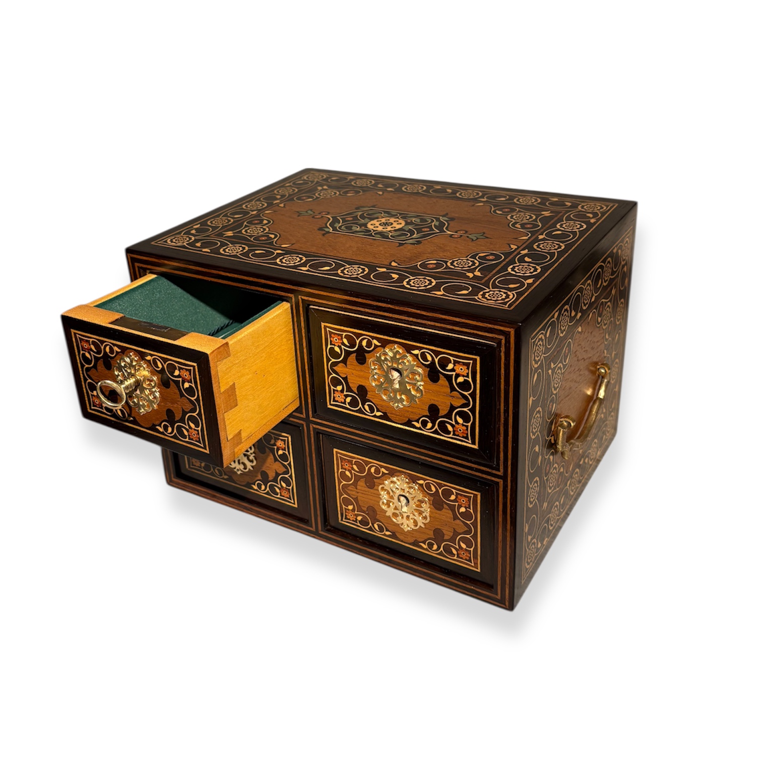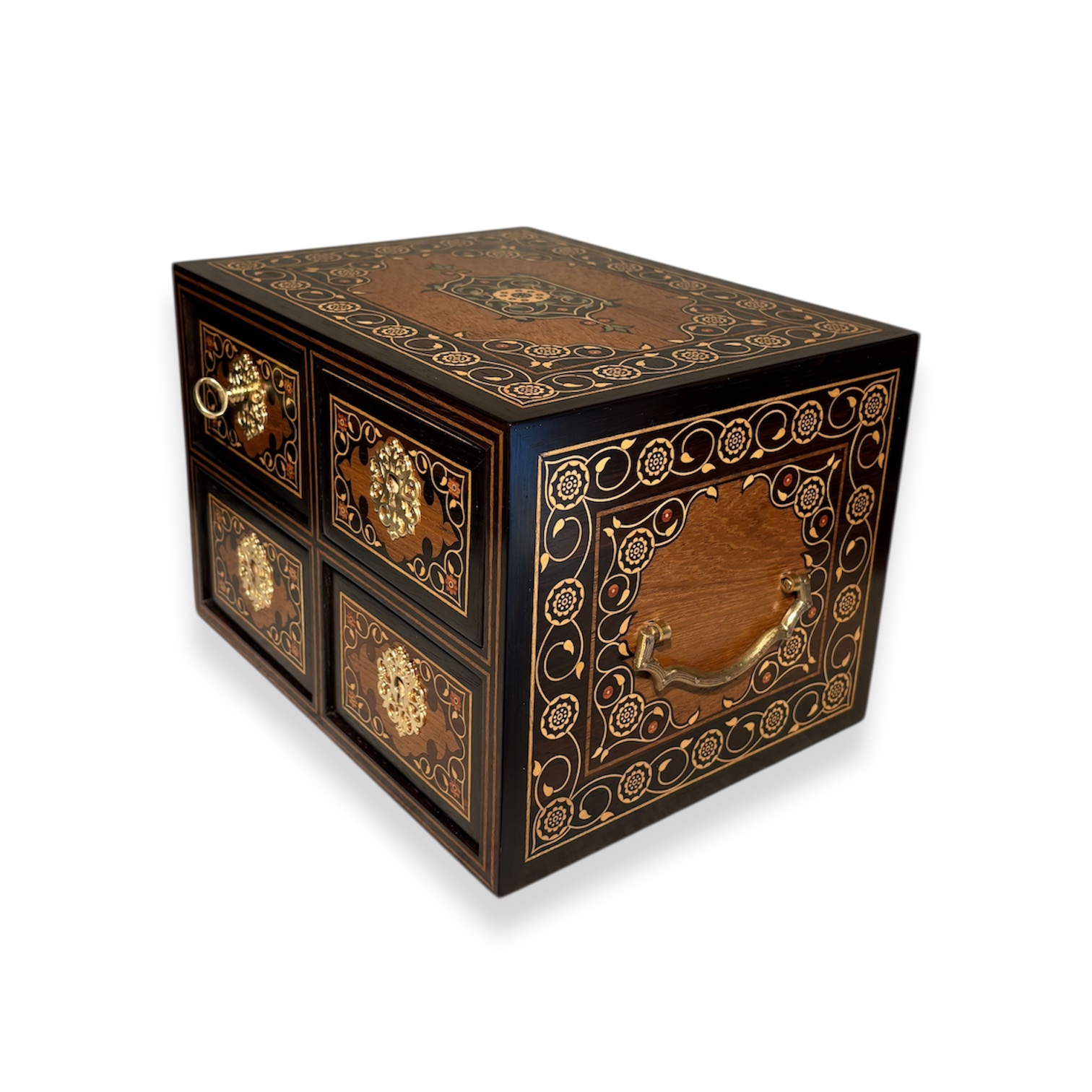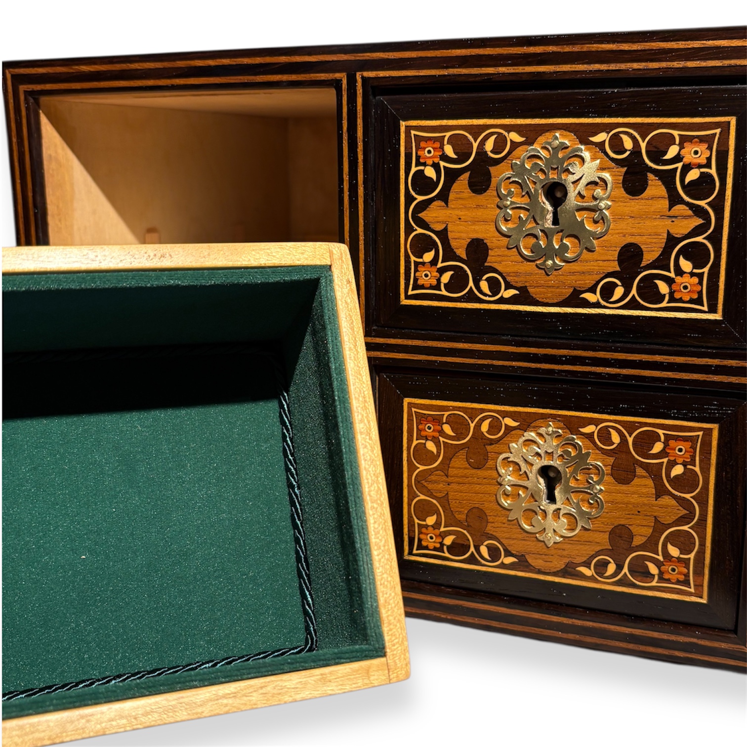 Feito com madeiras nobres como Pau Santo, madeira Teca, madeira buxo e madeira pau rosa. Gavetas em madeira cetim, forradas com veludo italiano. Ferragens em latão, cravadas à mão.