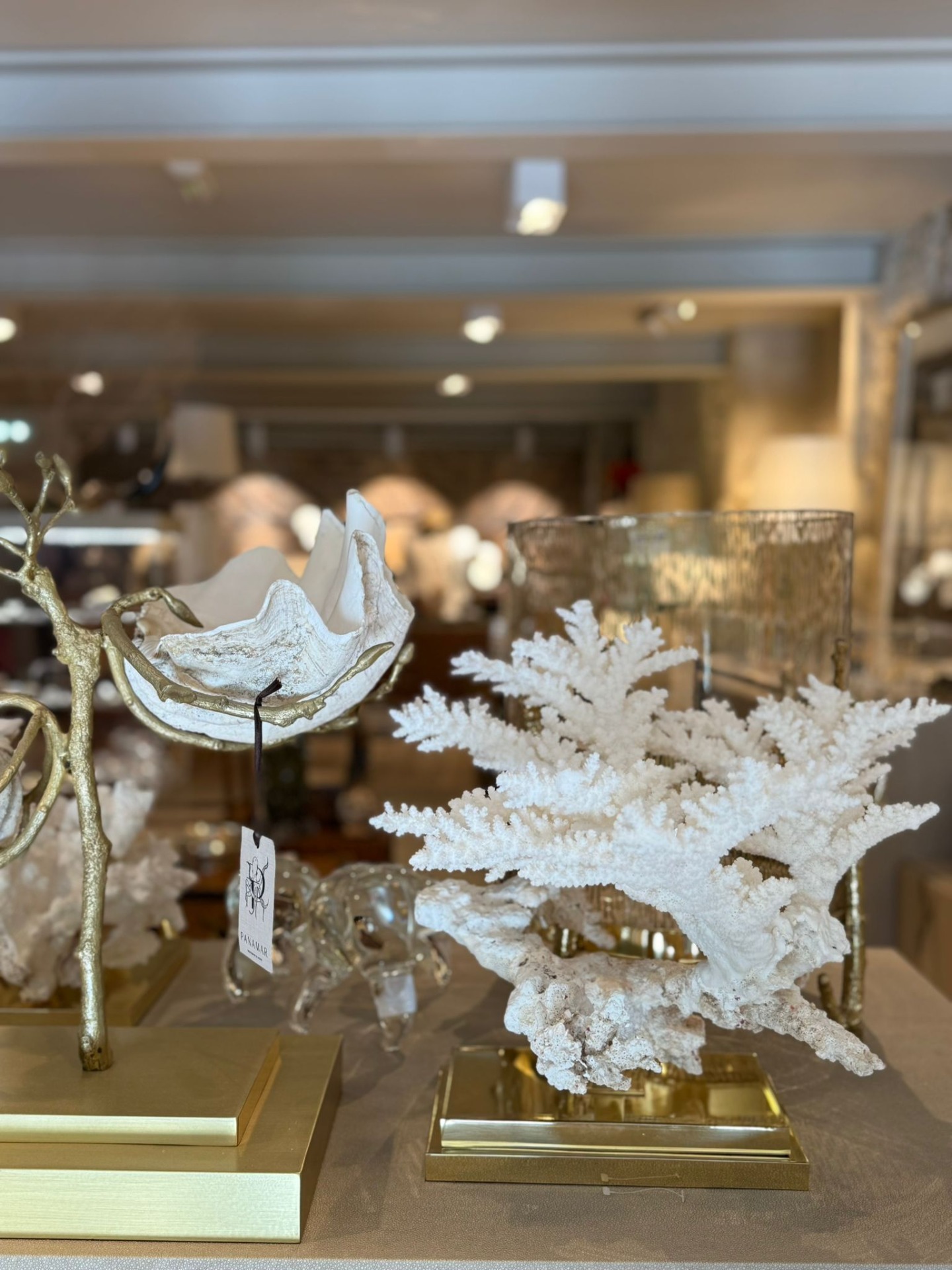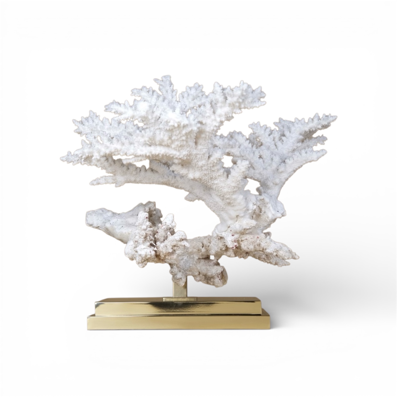 Coral acropola florida numa base de dois andares de latão dourado.