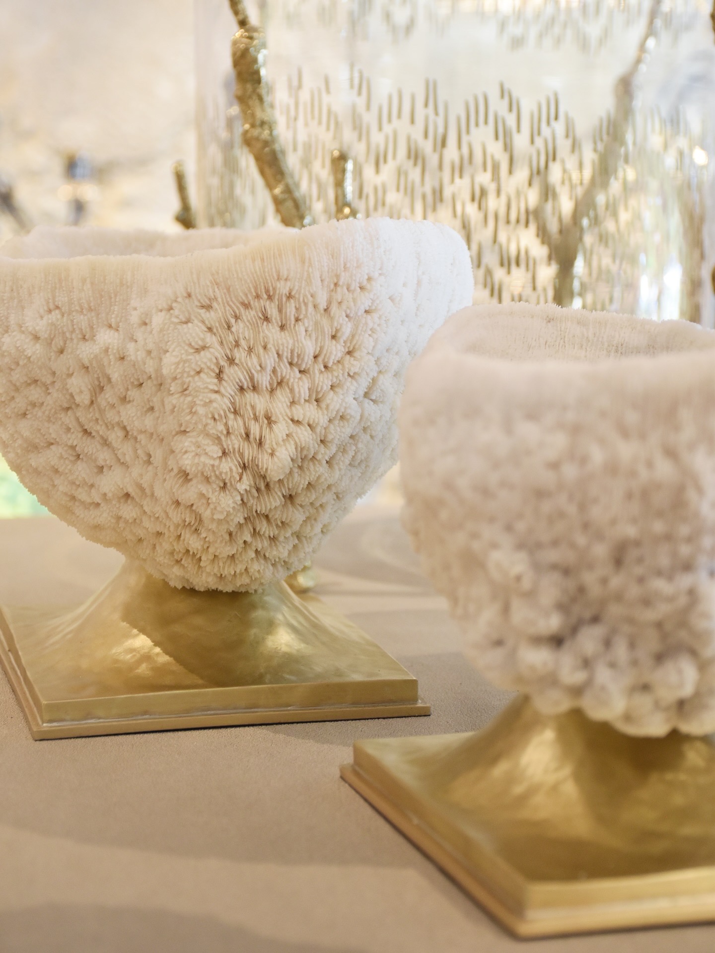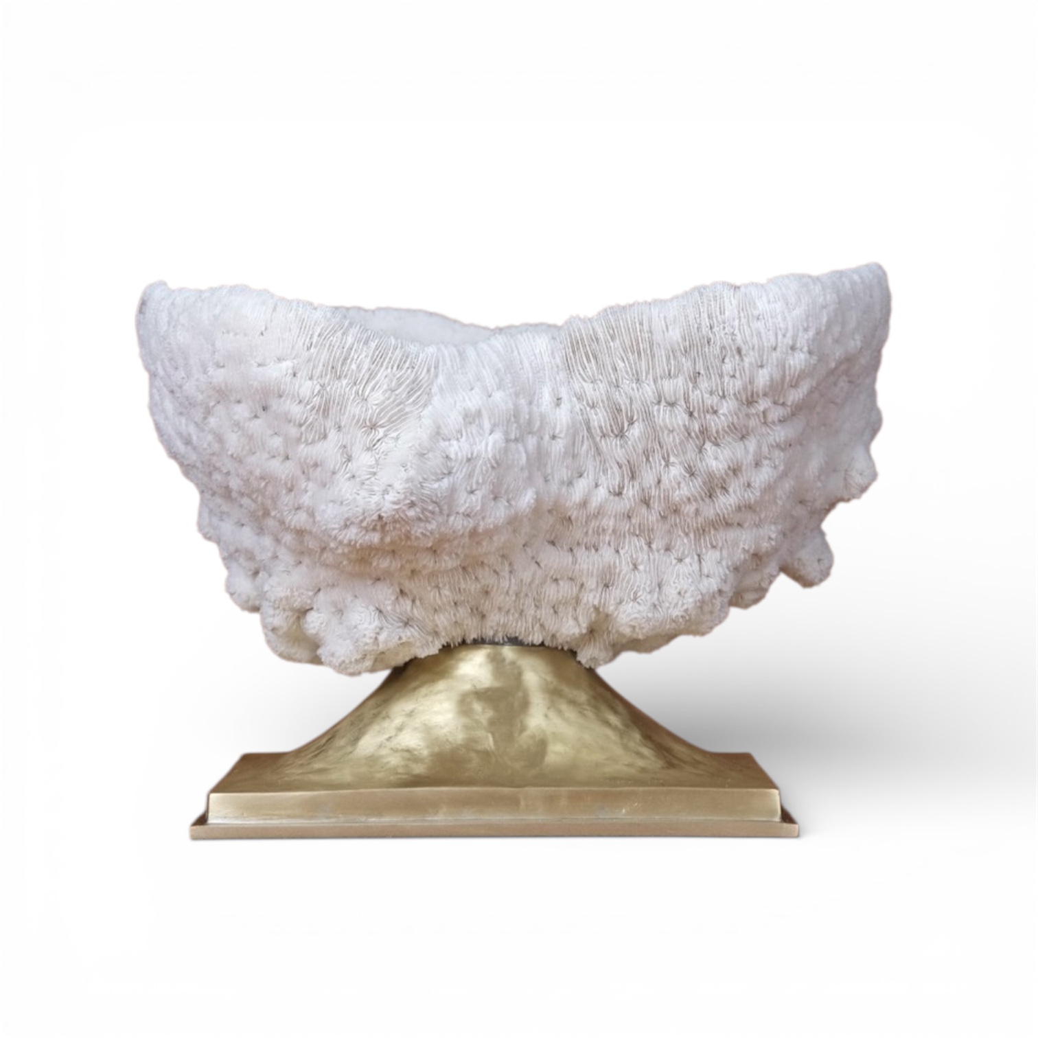 Coral Halomitra plieus em taça numa base de latão polido dourada, feito à mão.