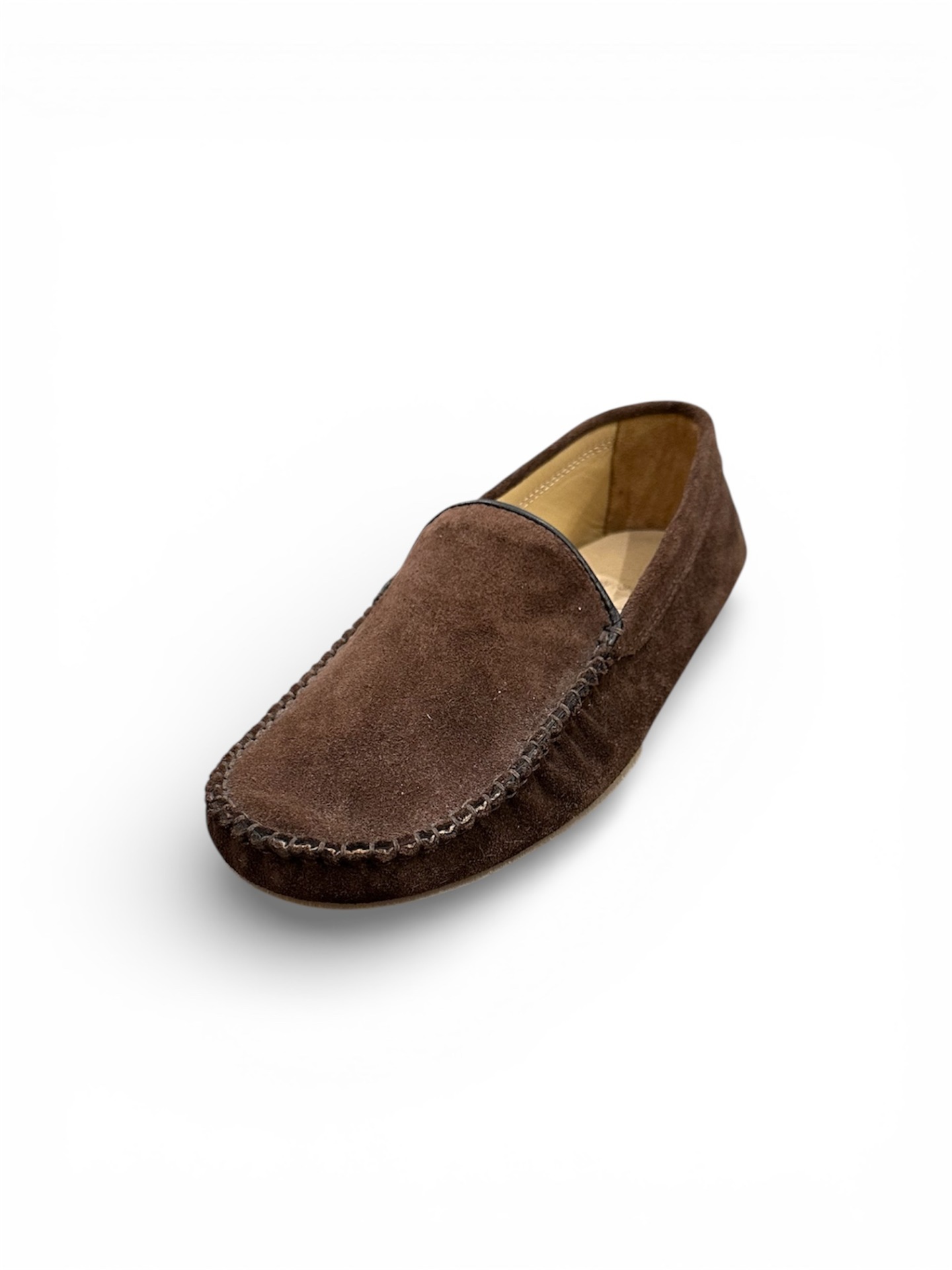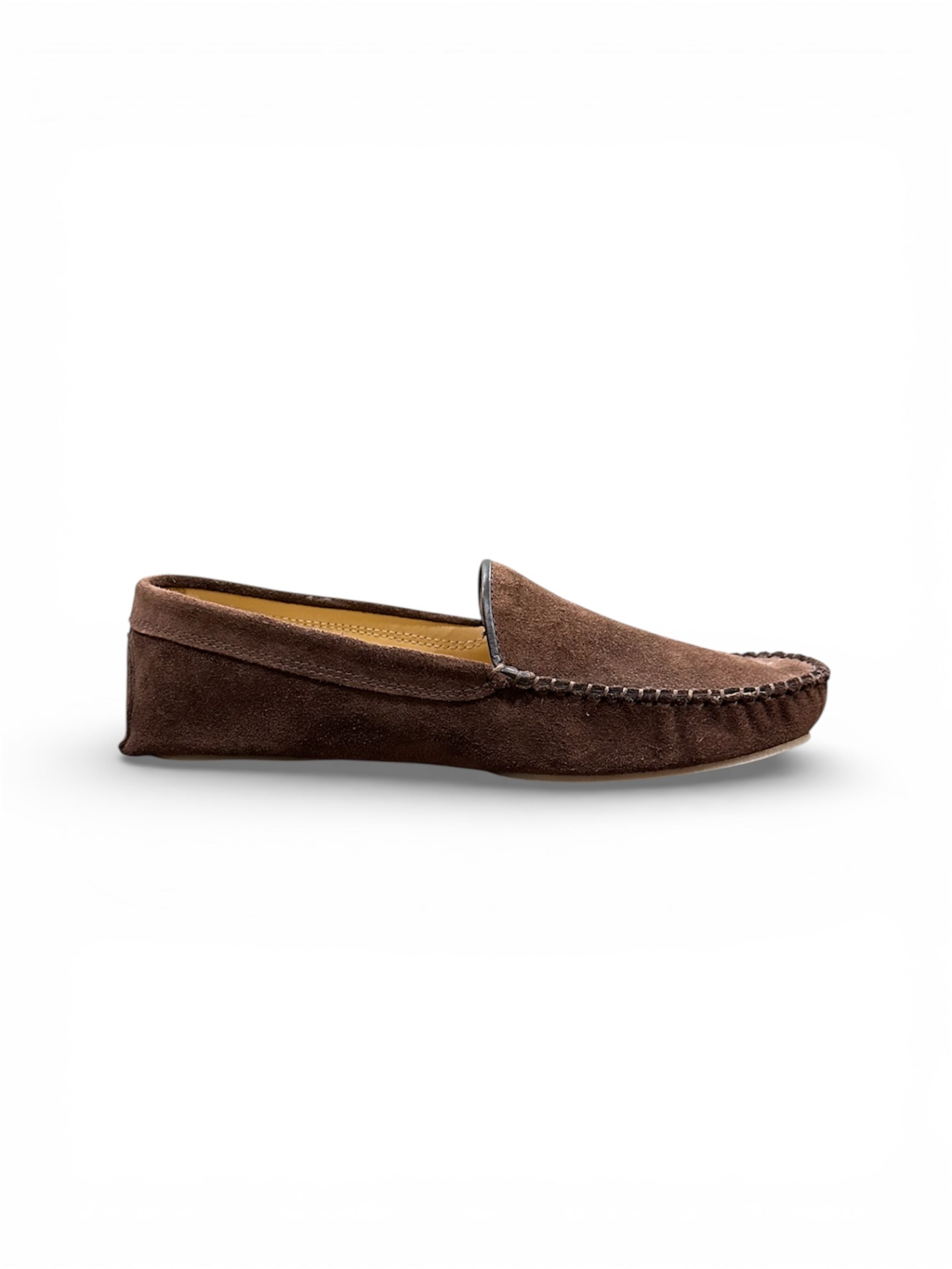 Mocassim de suede feito à mão, disponível em 3 cores: castanho, taupe e bege.
