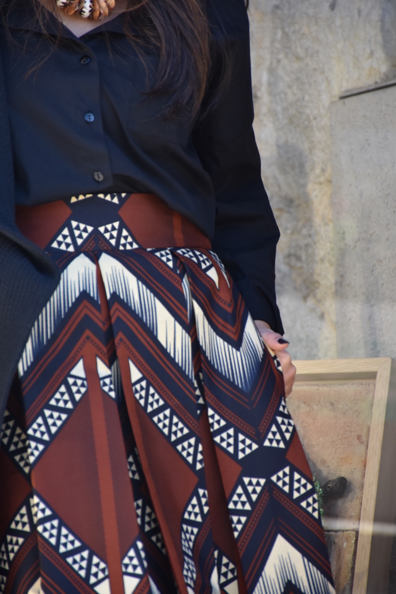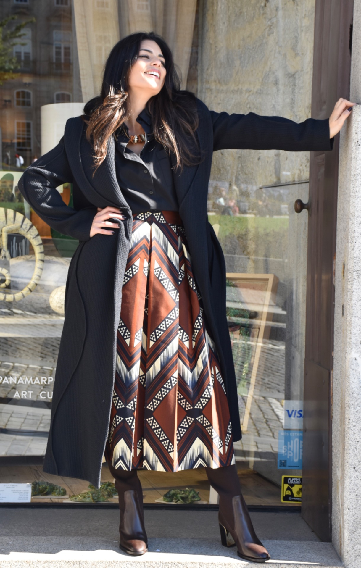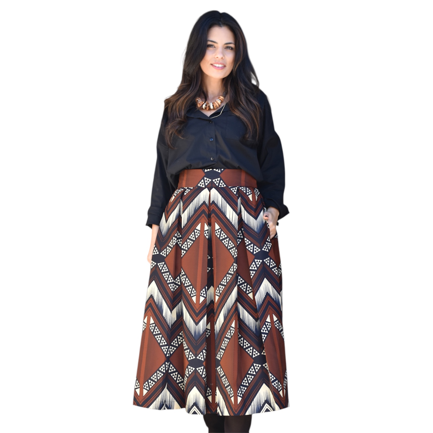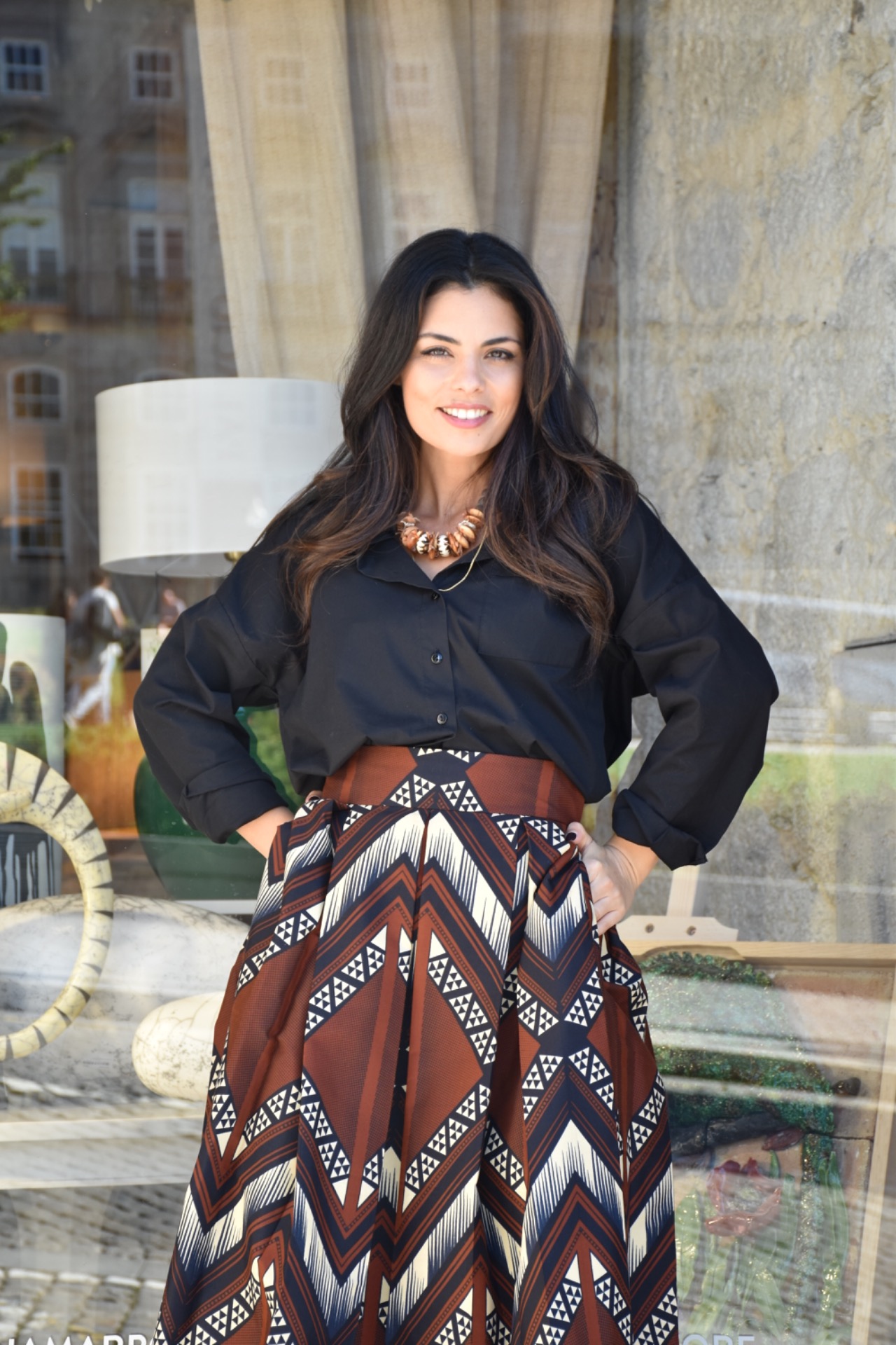 Saia capulana de inspiração africana, em algodão, com pregas cuidadosamente trabalhadas que realçam a silhueta ampulheta. Confortável e cheia de personalidade, ideal para um look feminino.