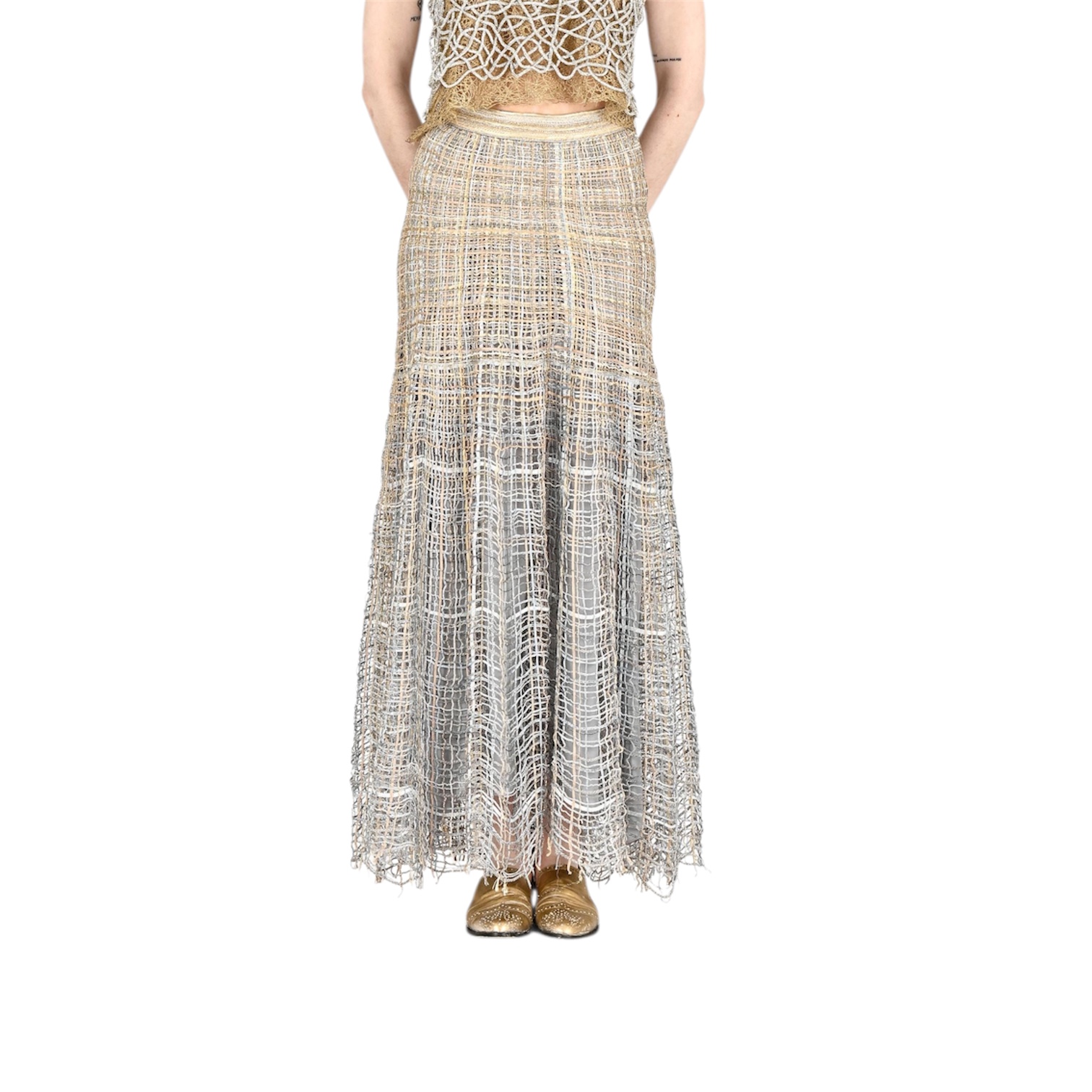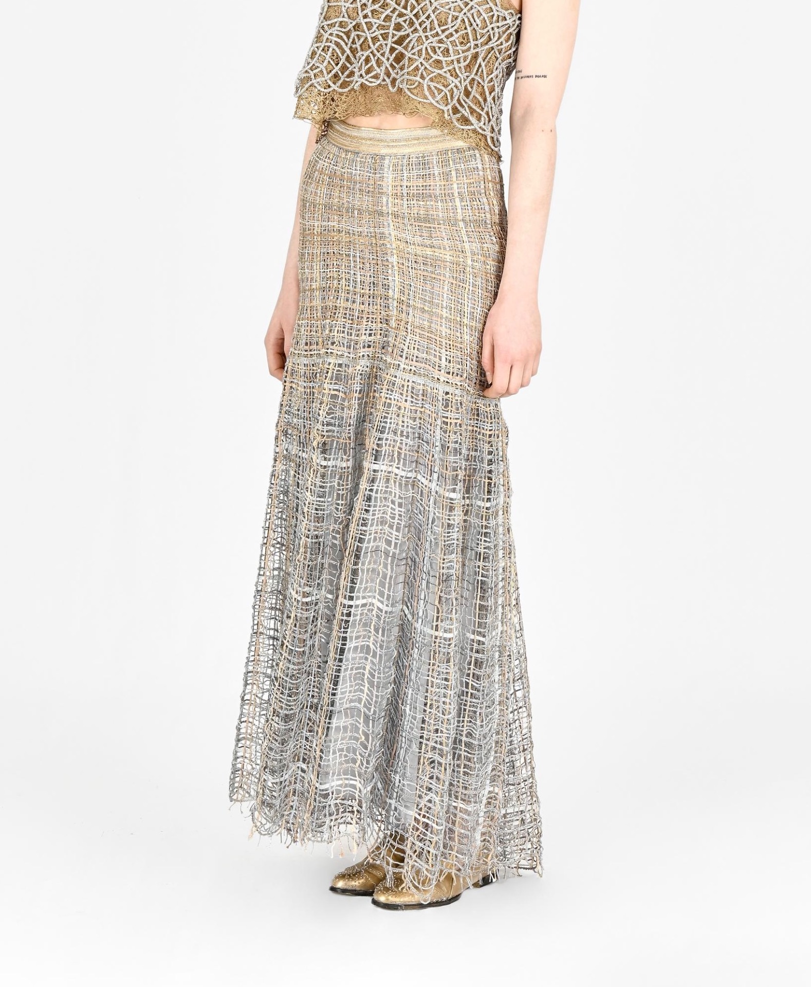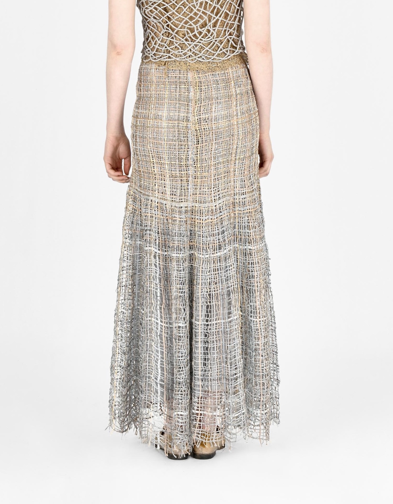 Saia confeccionada em mistura de fios trabalhados artesanalmente. O modelo valoriza a silhueta com cintura marcada, corte sereia e acabamento com bainha translúcida. Peça feita artesanalmente em Portugal.