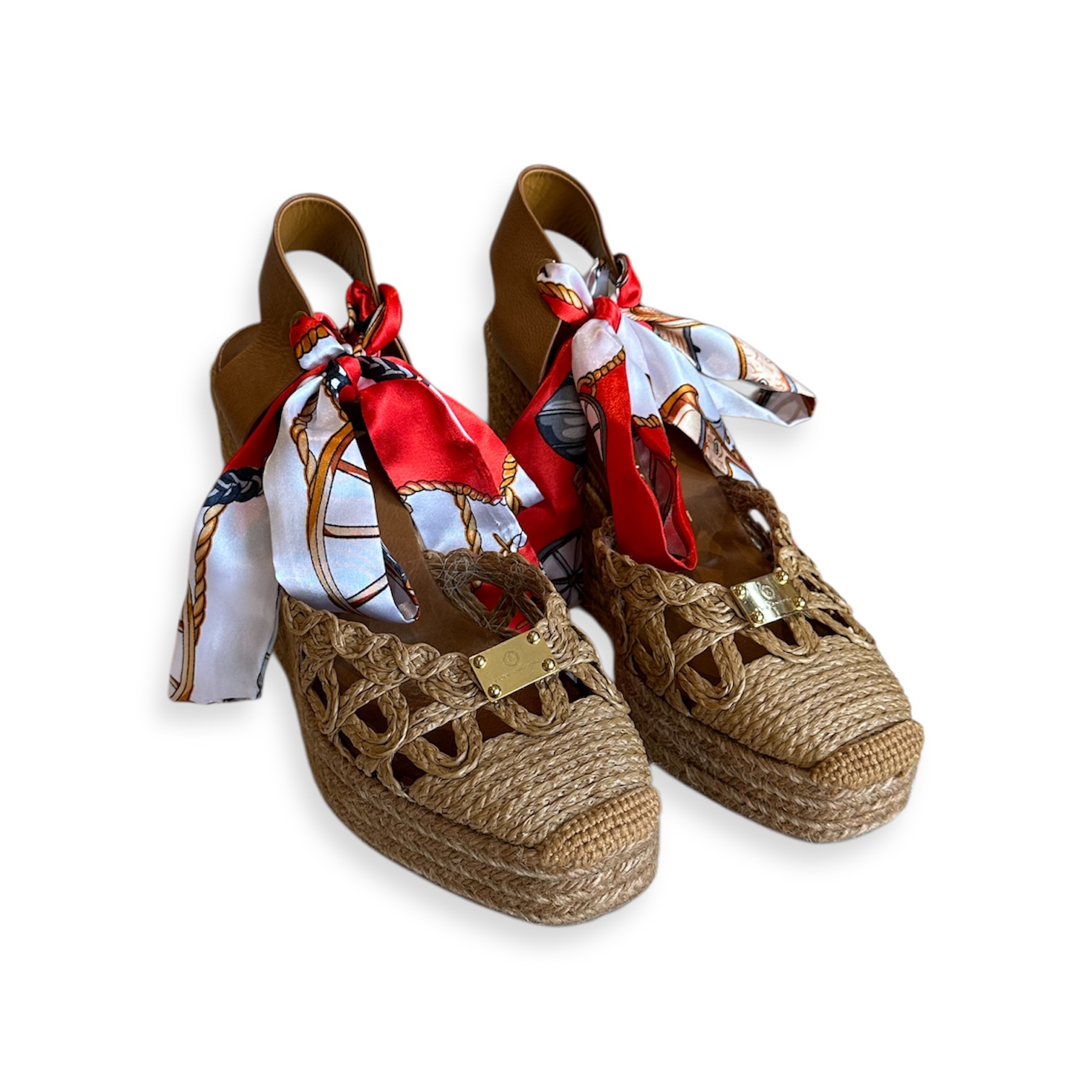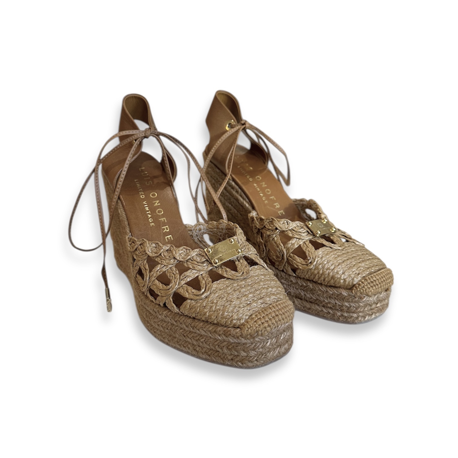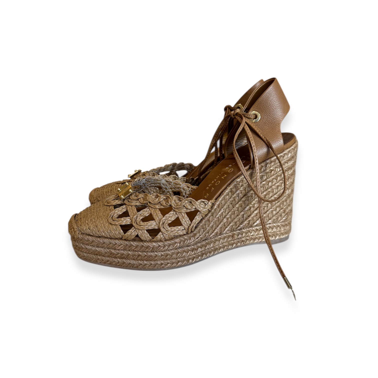 Sandália de cunha com cordão de tecido incluído.