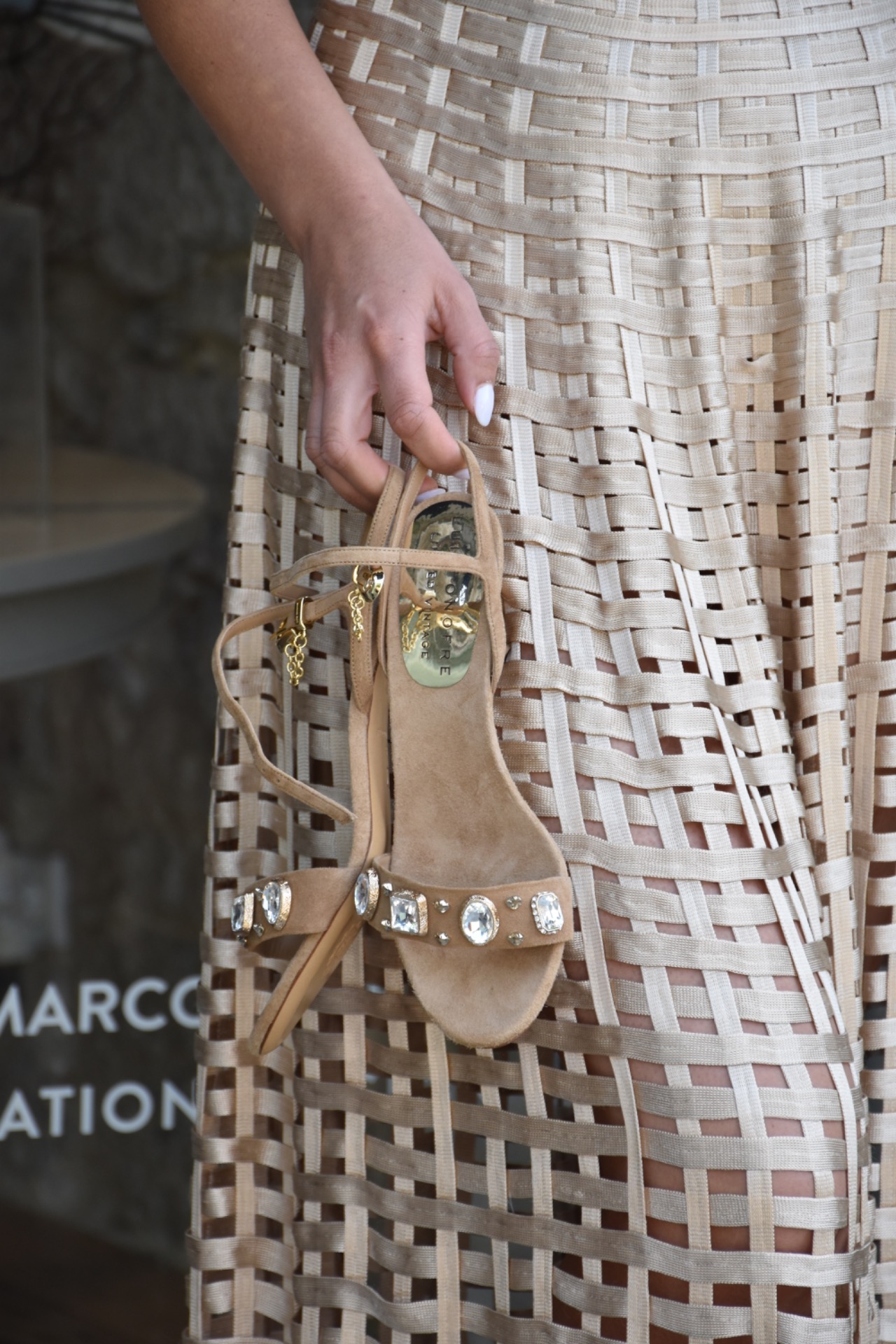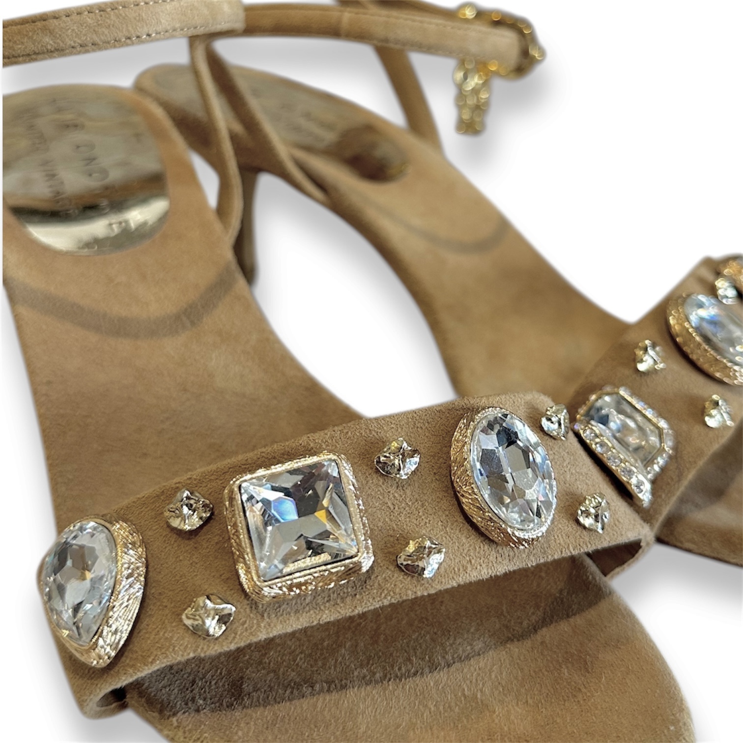 Sandálias com salto pequeno e aplicações de cristais na tira frontal.