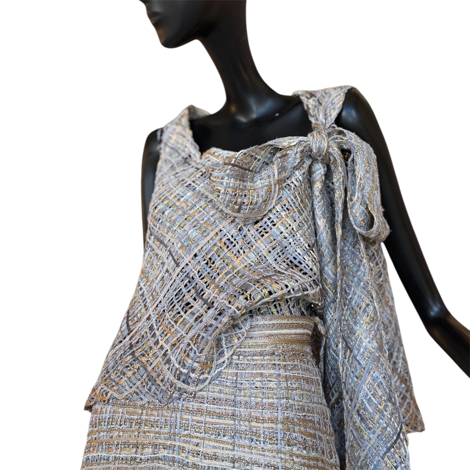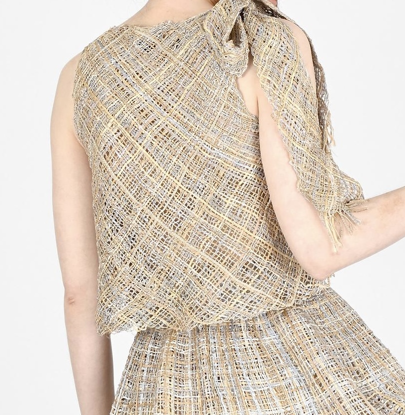 Top confeccionado em mistura de fios trabalhados artesanalmente. Top curto em viés, com caimento fluido, leve elasticidade que acompanha as curvas do corpo e laço ajustável no ombro. Peça feita artesanalmente em Portugal.
