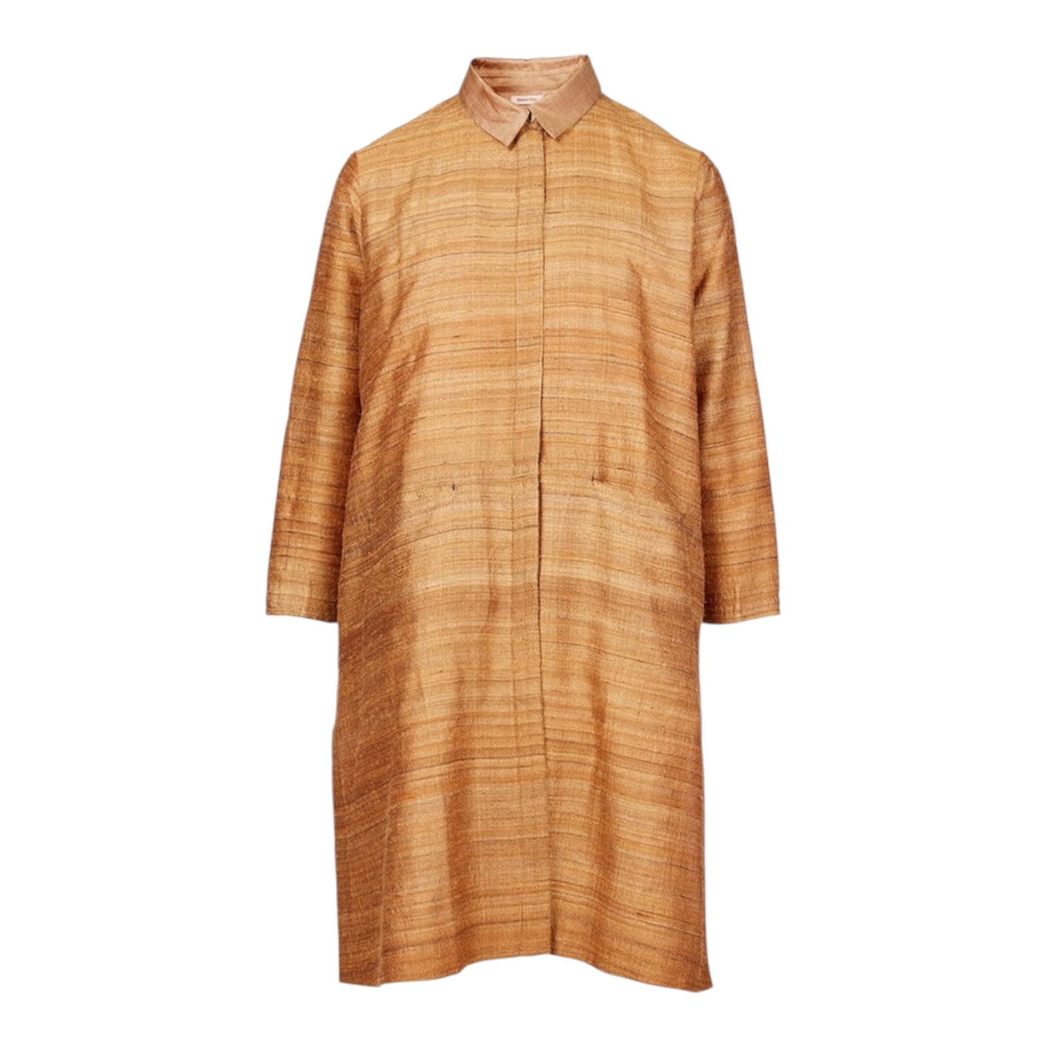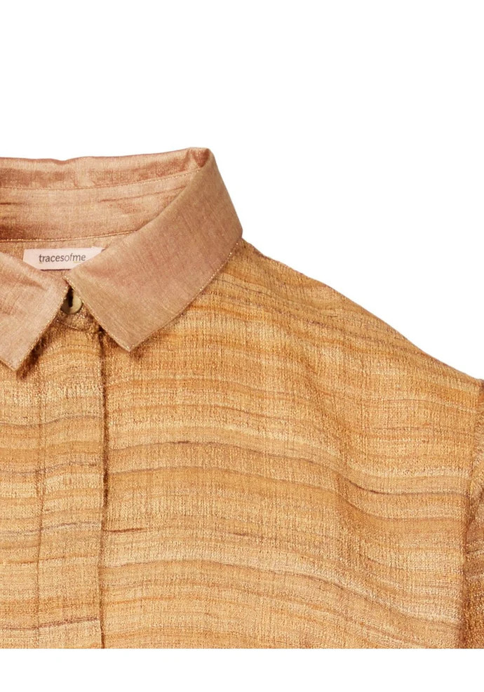 Túnica de seda Tussar pesada com botões, painel traseiro plissado, bolsos frontais e gola contrastante. Os detalhes de costuras metálicas refinadas elevam esta peça a um nível superior.