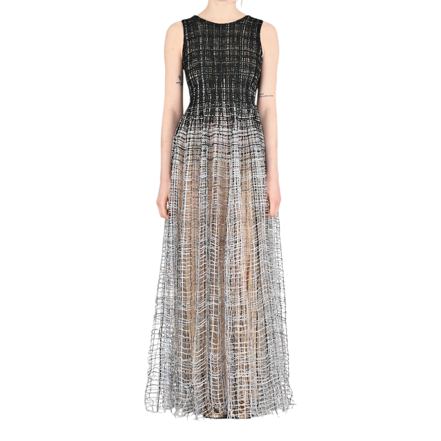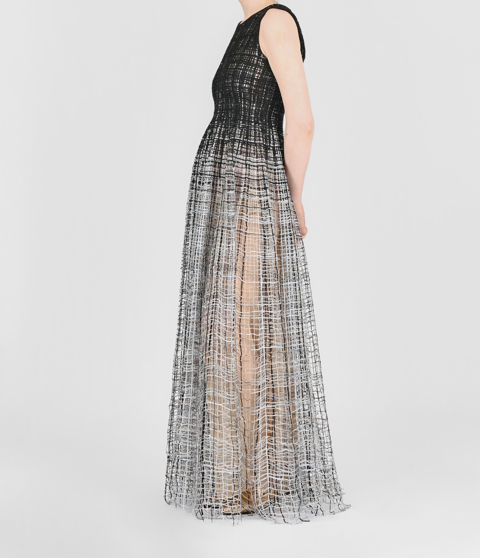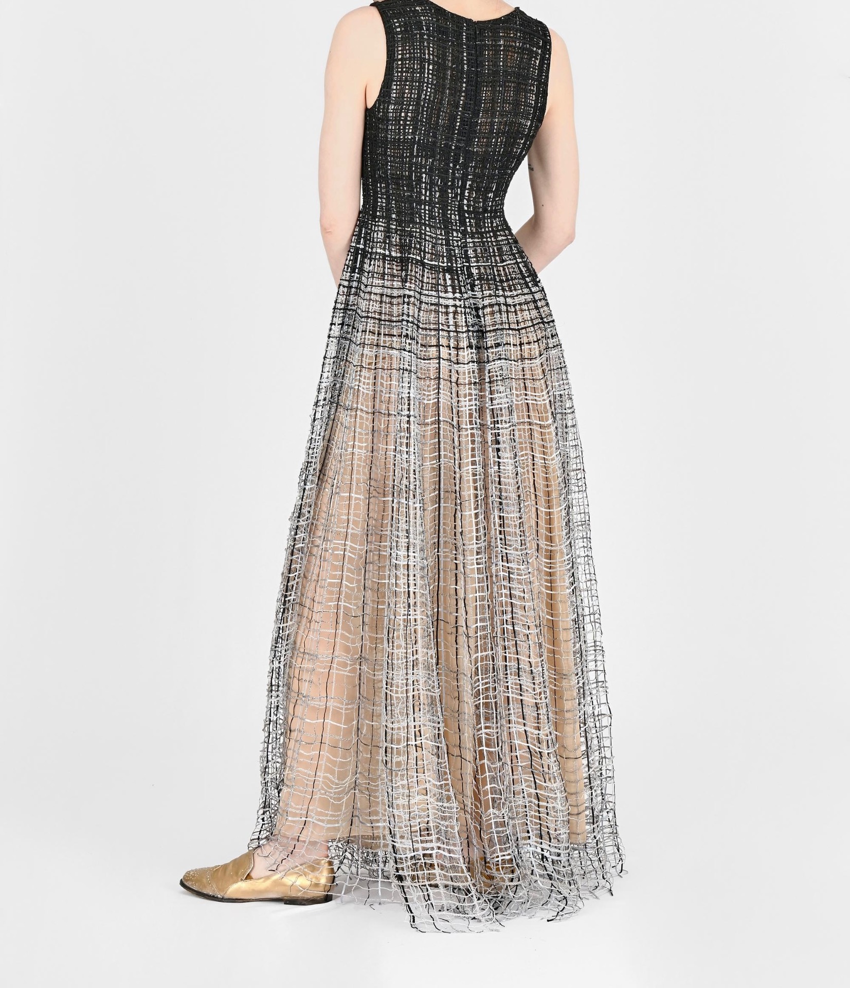 Vestido confeccionado em mistura de fios trabalhados artesanalmente. O modelo valoriza a silhueta com cintura marcada e acabamento com bainha translúcida. Peça feita artesanalmente em Portugal.