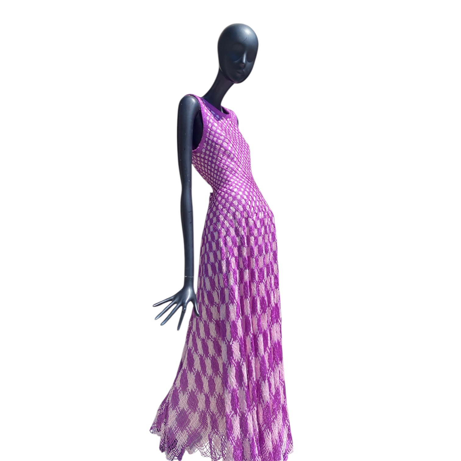 Vestido confeccionado em mistura de fios trabalhados artesanalmente que formam um elegante padrão de xadrez.O modelo valoriza a silhueta com cintura marcada e acabamento com bainha translúcida. Peça feita artesanalmente em Portugal.