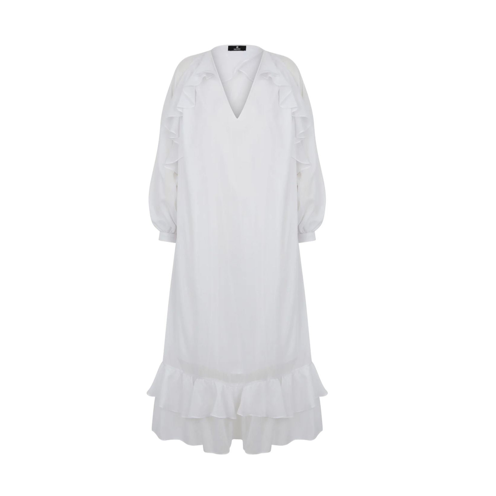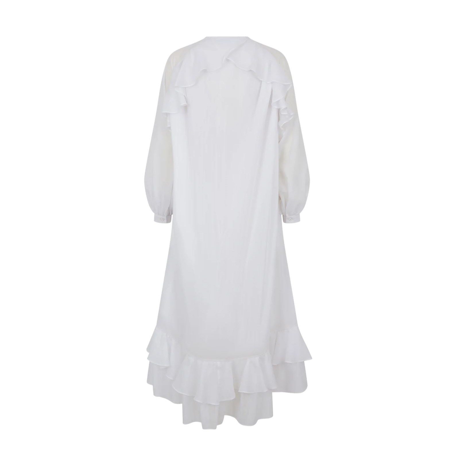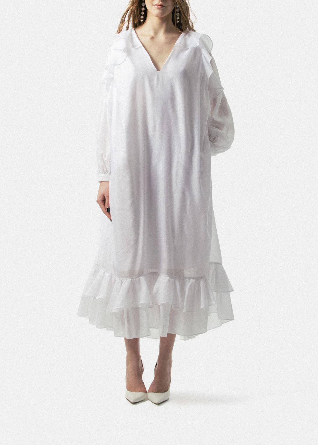 Vestido em decote em V com mangas compridas, bolsos laterais e ombros franzidos à frente e atrás com folhos evasés. A parte inferior do vestido apresenta dois folhos evasés. Vestido de linho.